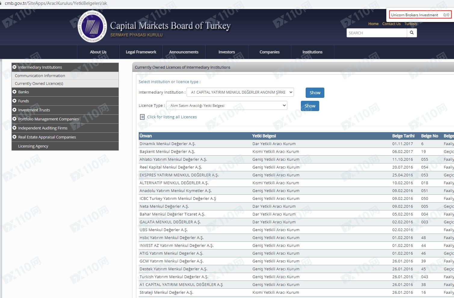 通過下載該平臺MT4,其公布的位置信息位于土耳其,軟件登記的公司名稱:Unicorn Brokers Investment Consulting Limited Co.,我們在土耳其CMB輸入:Unicorn Brokers Investment,查無資料,顯然該平臺并無監管。