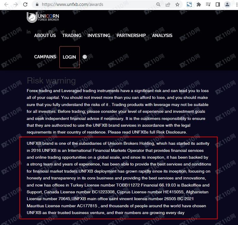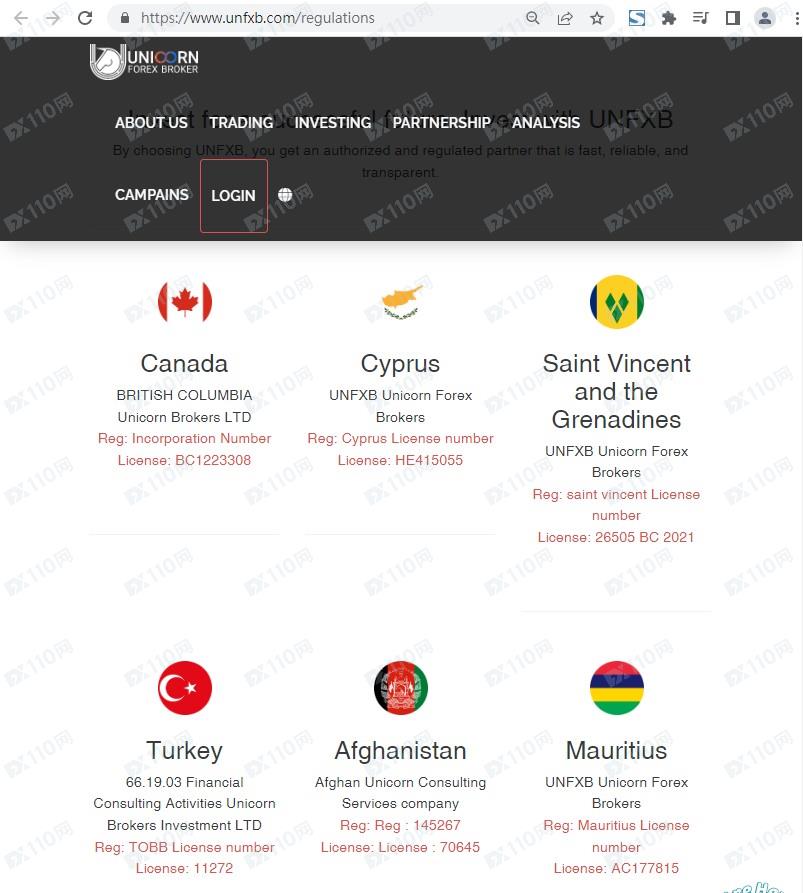 網址https://www.unfxb.com/,網頁中標示有以下許可及監管,在土耳其的許可證號Financial 66.19.03、在加拿大的許可證號BC1223308、在塞浦路斯的許可證號HE415055,在阿富汗的許可證號70645、在聖文森特的許可證號26505 BC 2021、在毛裏求斯的許可證號AC177815。