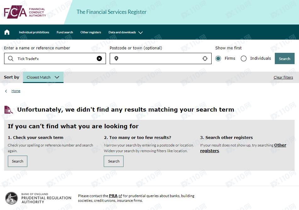 我們在英國工商局確實是有一家TICK TRADEFX LIMITED的注冊登記,但在英國金融監管局FCA并沒有登記,顯然不受監管!