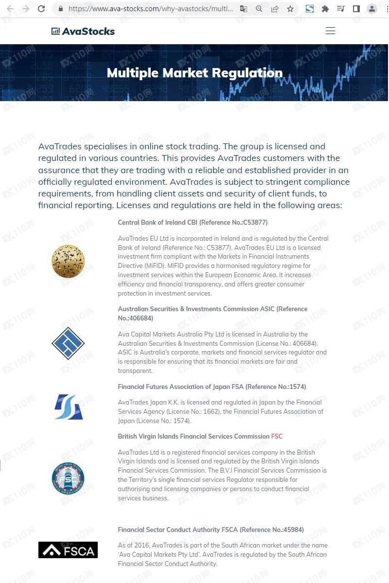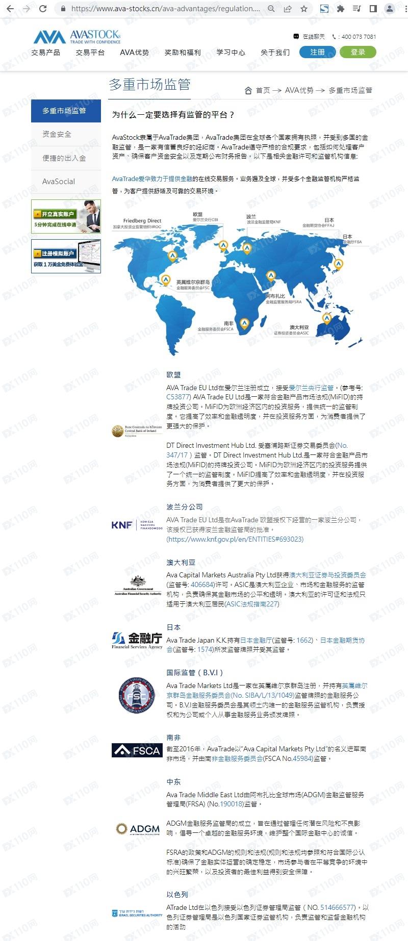 網頁中并標示了AvaTrade集團的監管信息,包含愛爾蘭CBI(號C53877)、塞浦路斯CySEC(號347/17)、波蘭PFSA、澳大利亞ASIC(號406684)、日本FSA(號1662)、日本FFAJ(號1574)、英屬維爾京群島BVIFSC(號SIBA/L/13/1049)、南非FSCA(號45984)、阿布扎比FSRA(號190018)、以色列ISA(號190018)。
