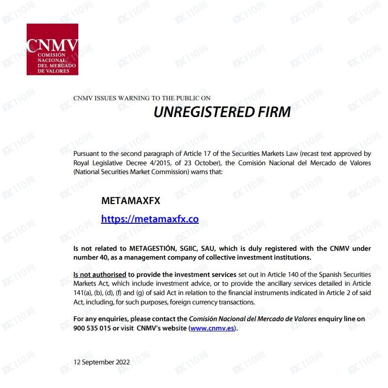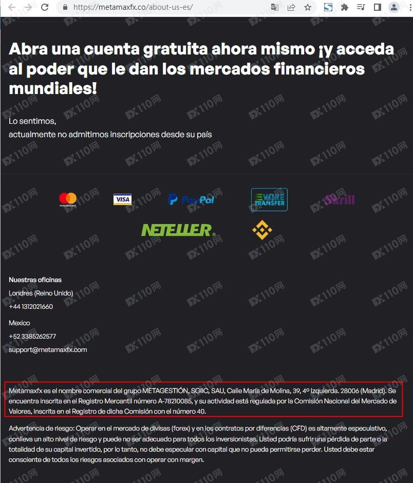 該平臺宣稱提供外匯、股指、貴金屬、加密貨幣等交易服務,是METAGESTIÓN, SGIIC, SAU, Calle Maríade Molina, 39, 4º Izquierda集團的商業名稱,受西班牙CNMV監管,編號40。