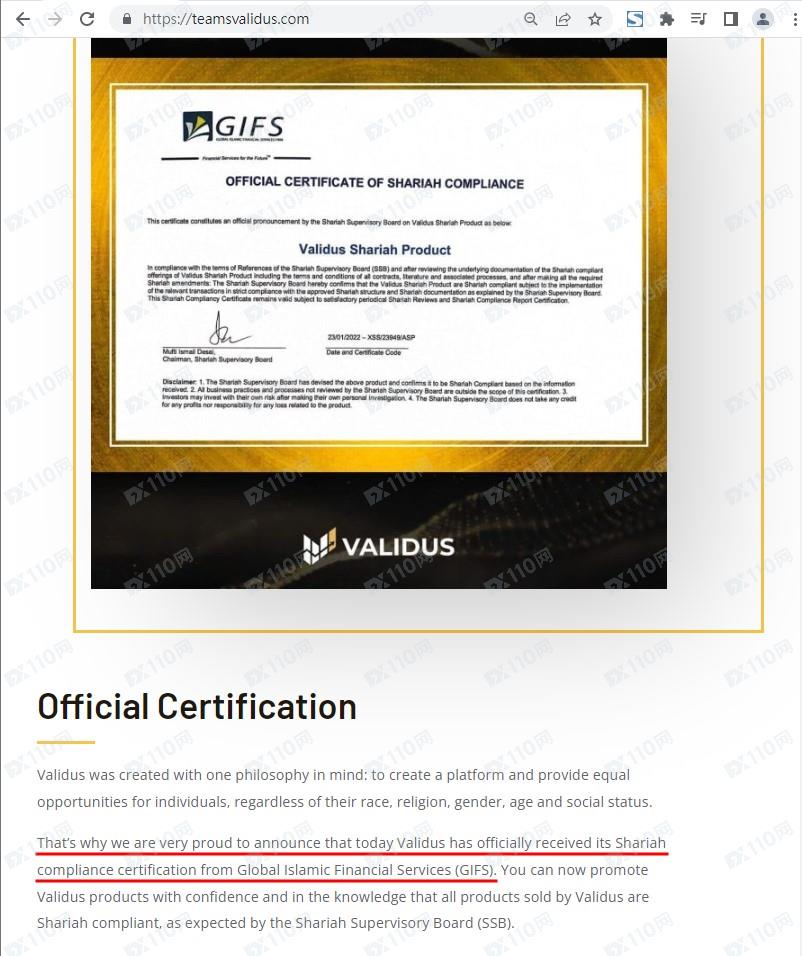 該平臺宣稱是一家在線貿易大學,通過VALIDUS交易60週并在此期間複利以獲得300%的回報,網頁中并標示獲得全球伊斯蘭金融服務 (GIFS) 的伊斯蘭教法合規認證,可推廣外匯、 股票、加密貨幣等金融產品組合。