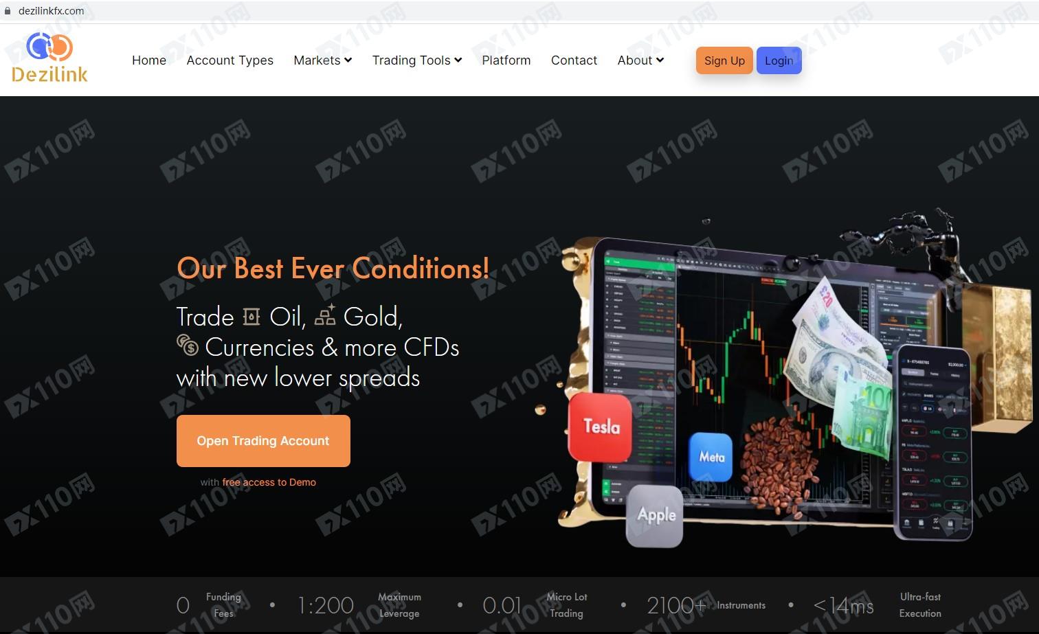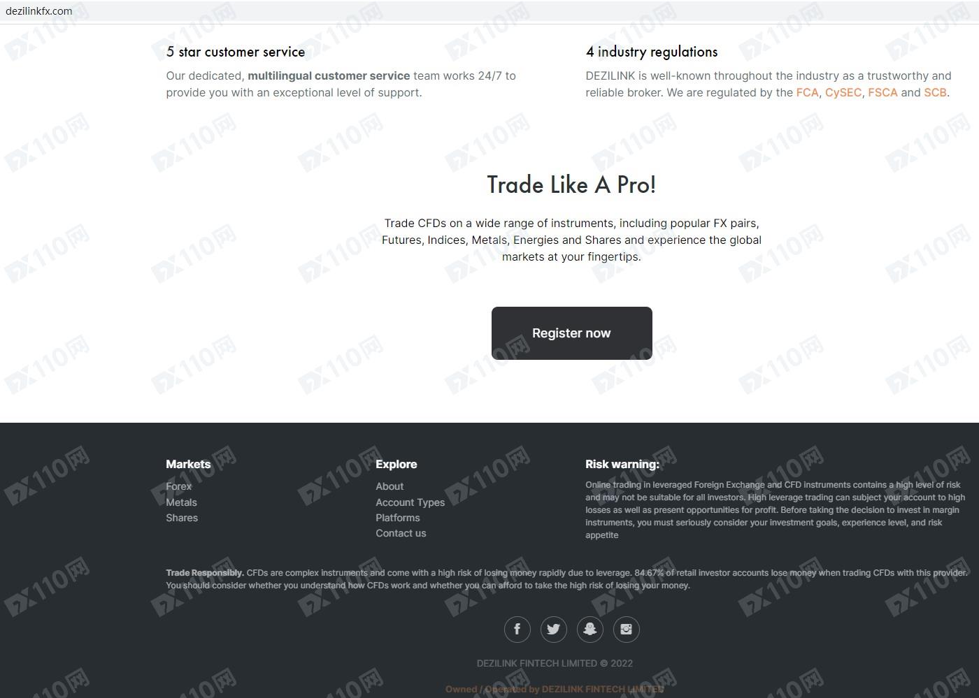該平臺宣傳由DEZILINK FINTECH LIMITED運營,地址位于圣文森特和格林納丁斯,受英國FCA、塞浦路斯CySEC、南非FSCA和巴哈馬SCB的監管,提供股票、外匯、金屬、指數等差價合約產品投資交易服務。