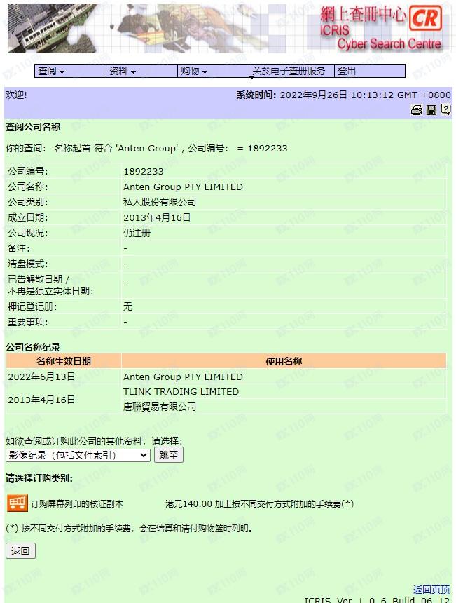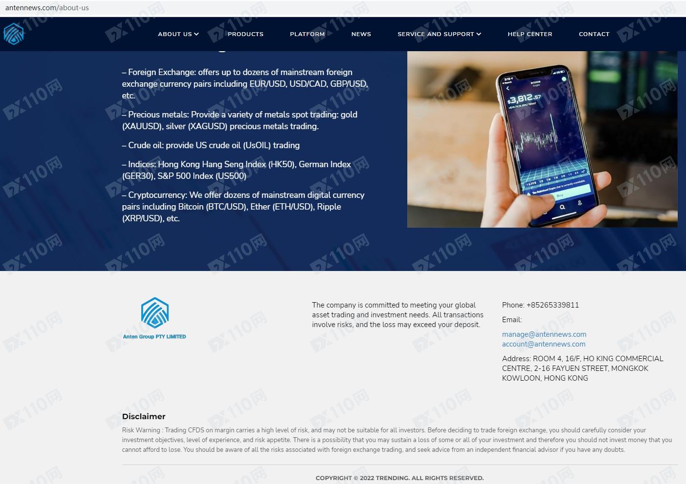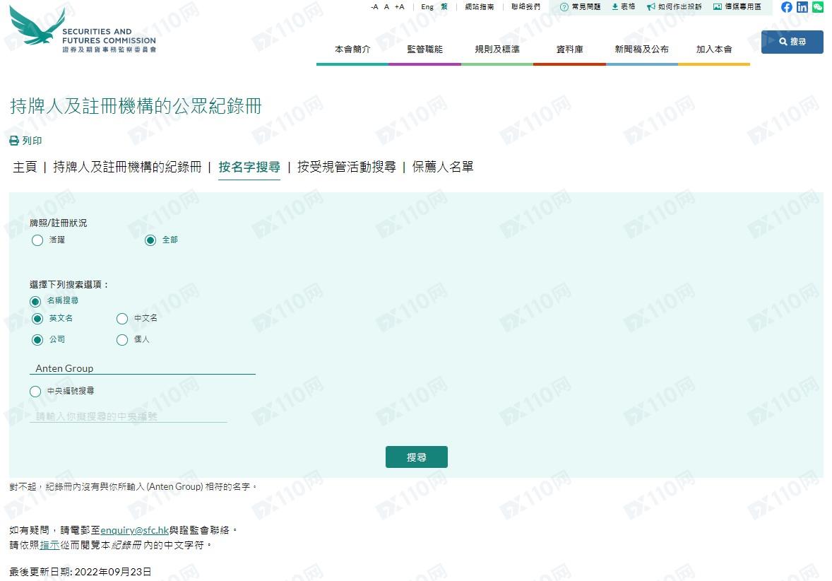 經查詢,在香港工商局有查詢到一家Anten Group PTY LIMITED,但請注意,有注冊不代表有監管,在香港SFC監管局并未查詢到該平臺的登記,顯然不受監管!