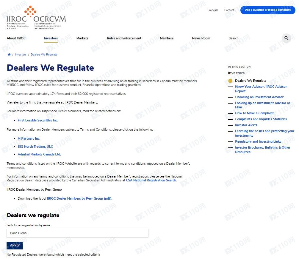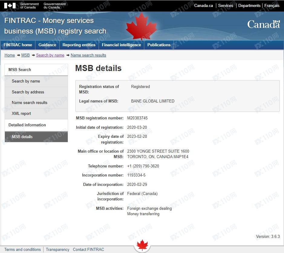 經查詢,加拿大MSB查詢到一家BANE GLOBAL LIMITED的注冊登記,加拿大投資行業監管組織IIROC并沒有登記,但請注意,美國FinCEN的MSB業務權限僅為貨幣兌換業務,不能提供外匯保證金業務,無金融衍生品的授權和監管權限。