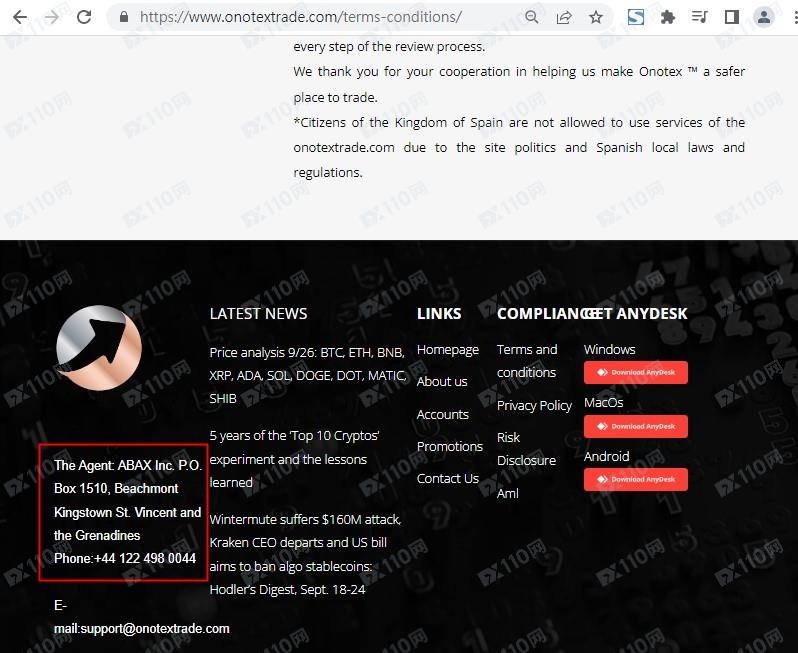 該平臺宣稱提供外匯、加密貨幣等交易服務,網頁中標示代理公司名稱ABAX Inc,位于圣文森特,聯系電話位置則位于英國,但未公布任何監管信息以便用戶核實。