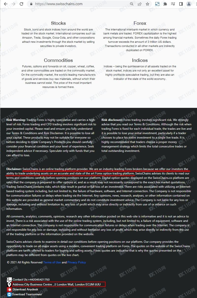 該平臺宣稱提供外匯、股指、商品等交易服務,但網頁上僅標示具體位置位于英國,未公布公司名稱及任何監管信息以便用戶核實。