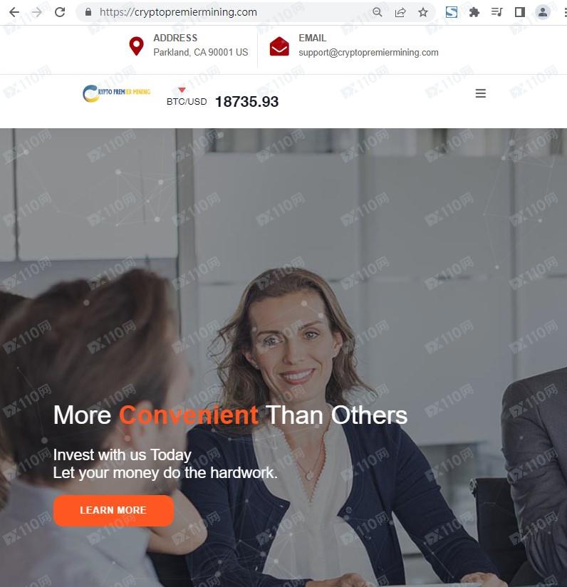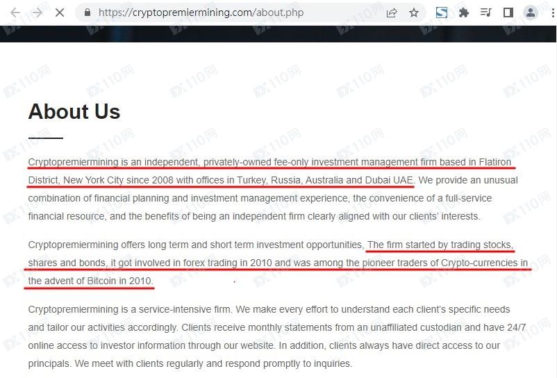 該平臺宣稱Cryptopremiermining是一家投資管理公司,總部位于美國紐約,在土耳其、俄羅斯、澳大利亞和阿聯酋迪拜設有辦事處,提供長期和短期投資機會,以股票、債券交易起家,也涉足外匯及加密貨幣交易,但網頁上未公布任何監管信息以便用戶核實。
