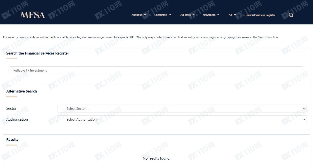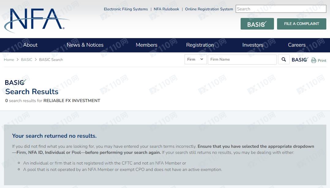 經調查,在馬耳他MFSA的授權服務提供商列表中并未查詢到Reliable Fx Investment的相關登記,在美國NFA監管局也查無任何結果,顯然不受監管!