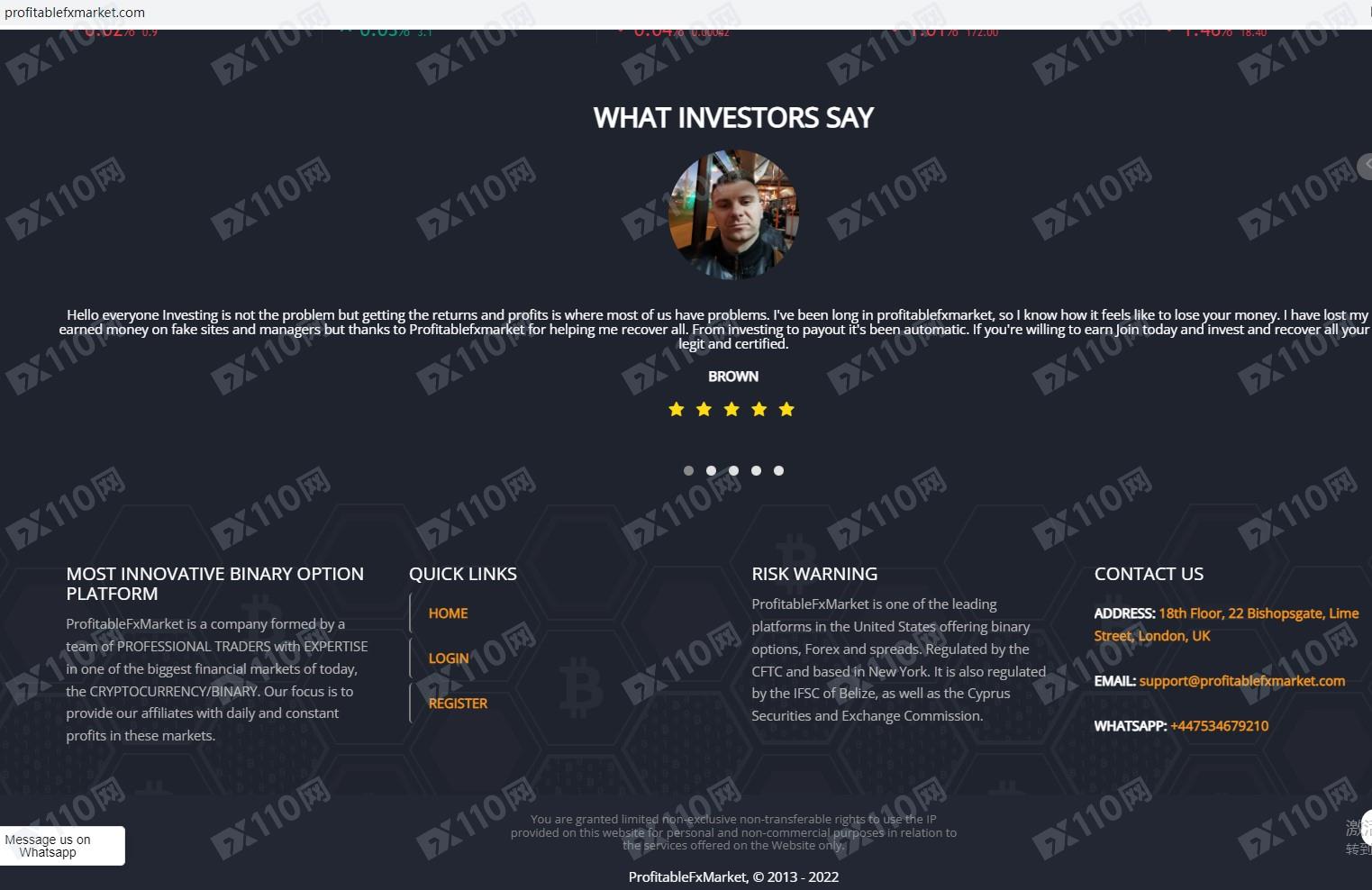 ProfitableFxMarket宣傳是一家美國的投資交易平臺,總部設在紐約,提供二元期權和外匯交易,受美國CFTC的監管,還受伯利茲IFSC和塞浦路斯CySEC的監管。