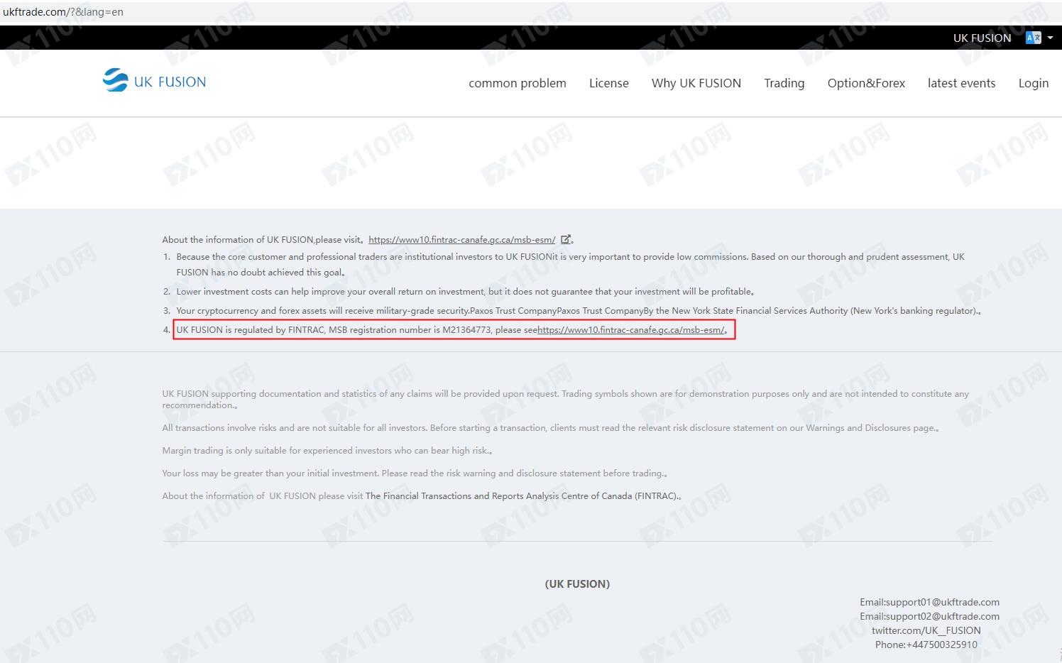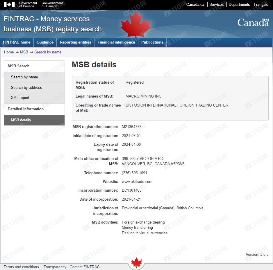 經查詢,加拿大MSB注冊號M21364773對應公司名稱UK FUSION INTERNATIONAL FOREIGN TRADING CENTER,登記網址為www.ukftrade.com,但請注意,加拿大FINTRAC不監管金融衍生品經紀,且MSB僅為加拿大貨幣服務注冊號,顯然該平臺并無有效監管!
