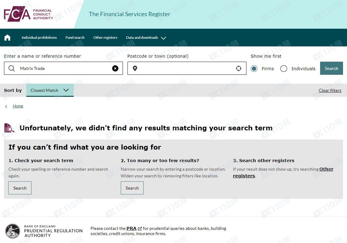 經查詢,英國工商局確實有查詢到Matrix Trade的相關注冊信息,但在FCA金融監管局并沒有登記,顯然不受監管!