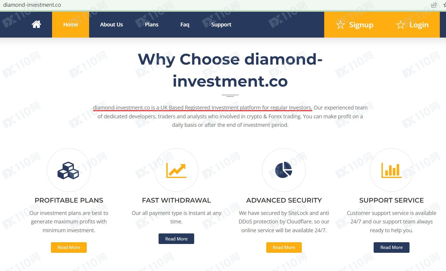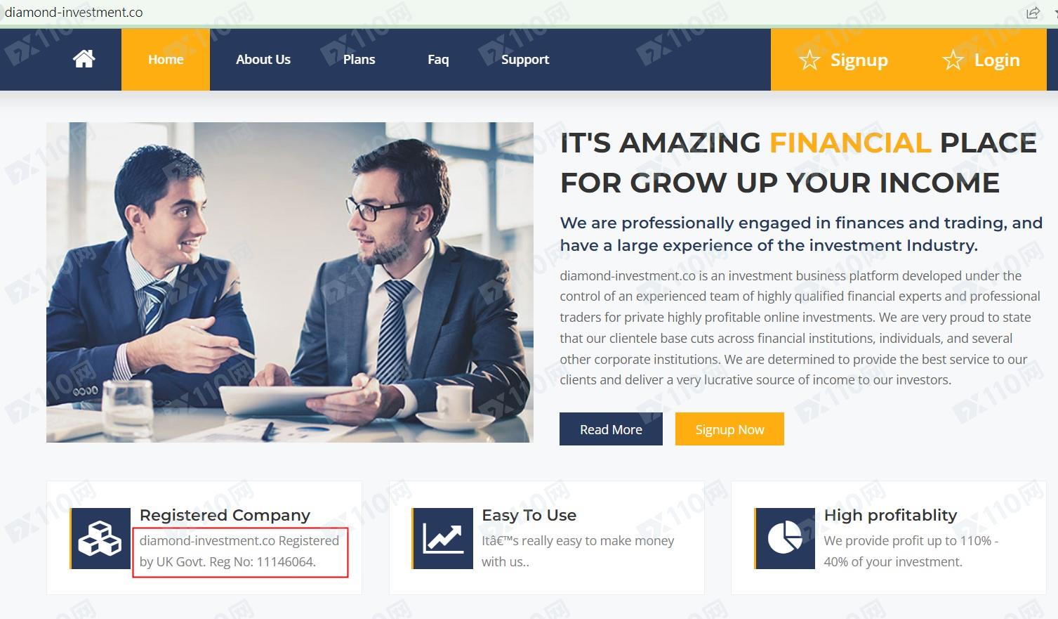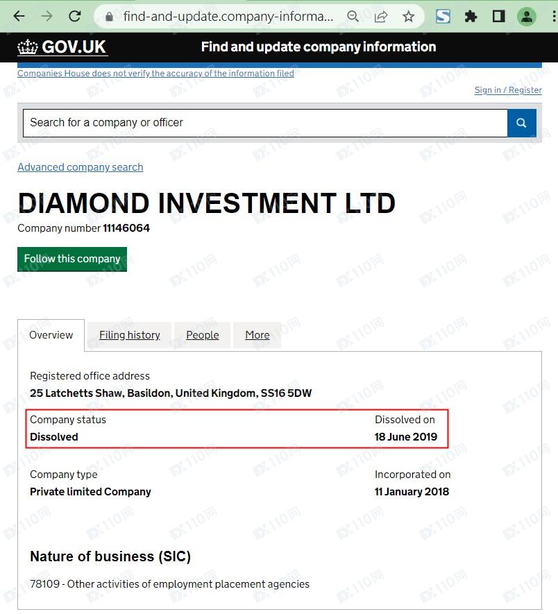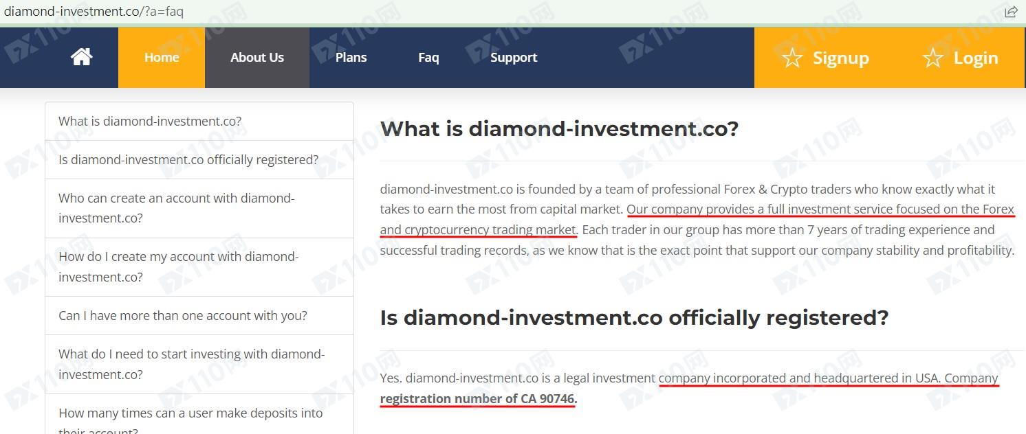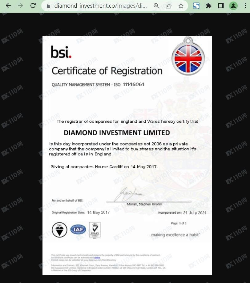 該平臺宣稱提供外匯和加密貨幣交易服務,是一家面向普通投資者的英國注冊投資平臺,公司名稱DIAMOND INVESTMENT LIMITED,英國注冊號11146064,總部設在美國,注冊號CA 90746,并持有bsi認證。