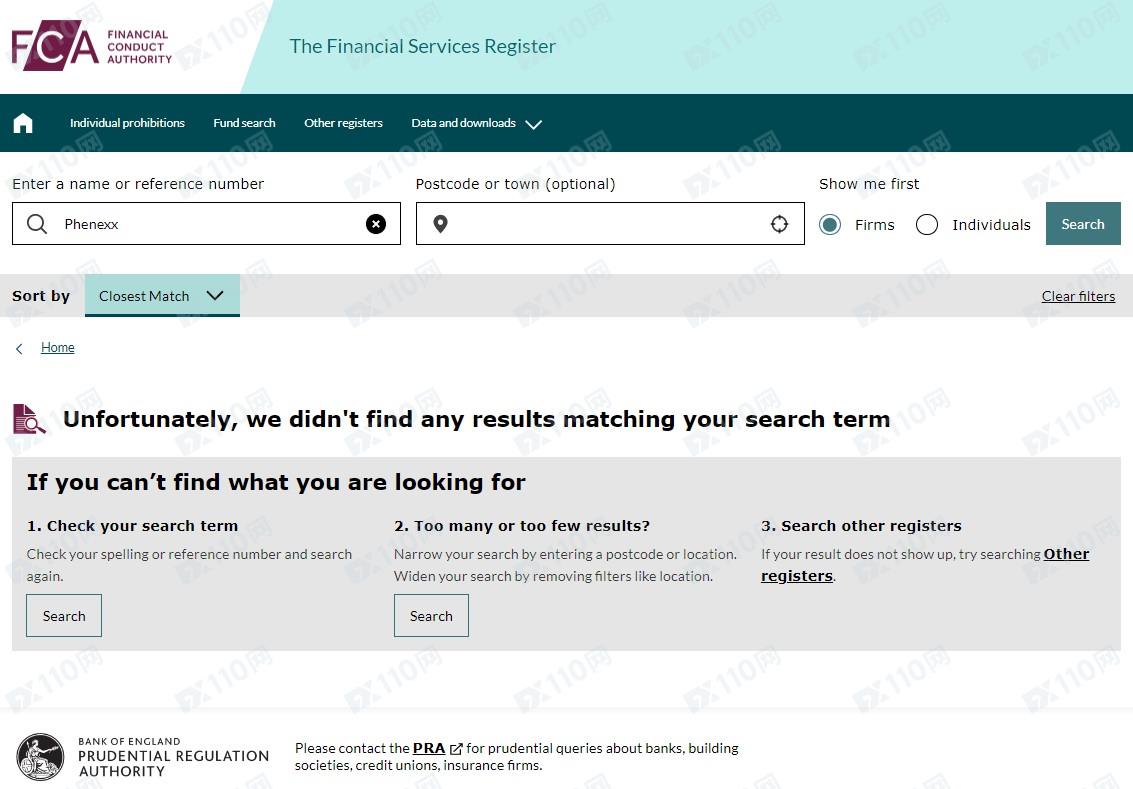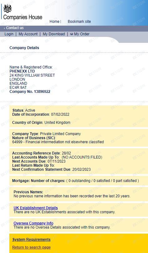 經查詢,在英國工商局有查詢到一家PHENEXX LTD的注冊登記,但請注意,有注冊不代表有監管,我們在英國FCA監管局并未查詢到該平臺的登記,顯然不受監管!