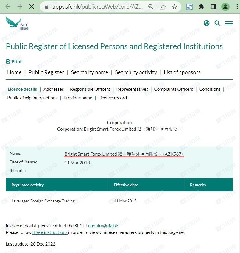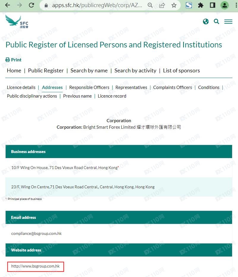 該平臺宣稱提供外匯交易及賬戶托管服務,是BC Solutions, Limited的商標名稱,BSF Ltd提供的許可經紀服務,在點擊訪問后會自動跳轉至香港證券及期貨事務監察委員會(SFC)的頁面,其登記名稱:Bright Smart Forex Limited 耀才環球外匯有限公司,證號AZK567,網址http://www.bsgroup.com.hk。