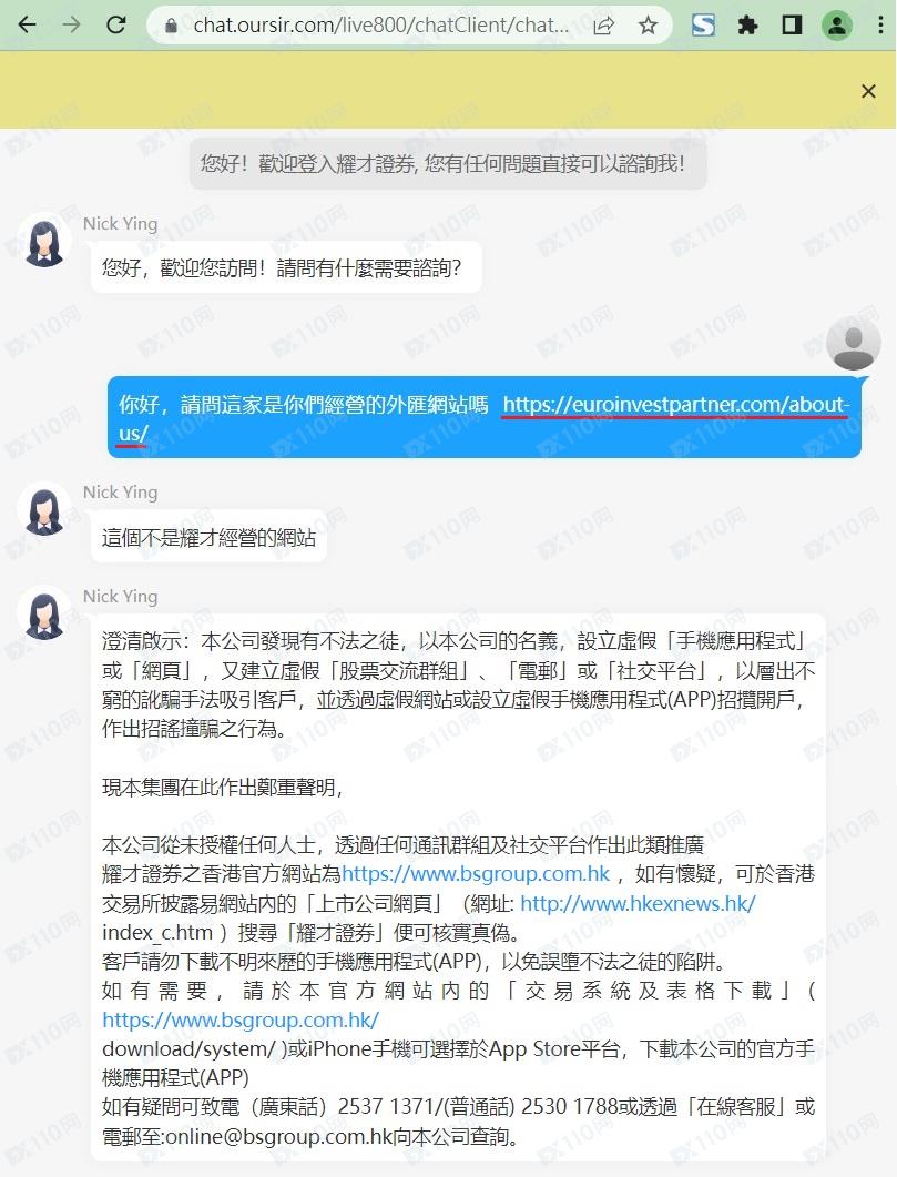 經諮詢耀才證券(http://www.bsgroup.com.hk)平臺官網客服,核實Euro Invest Partner平臺不是由他們運營的網站,無任何關連。