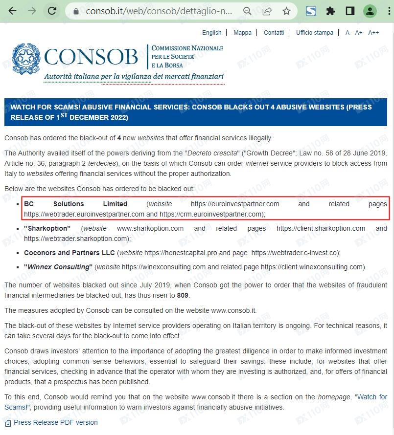 此外,該平臺未經授權即非法提供金融服務,已被意大利金融市場監管局(CONSOB)列入警示,請遠離!