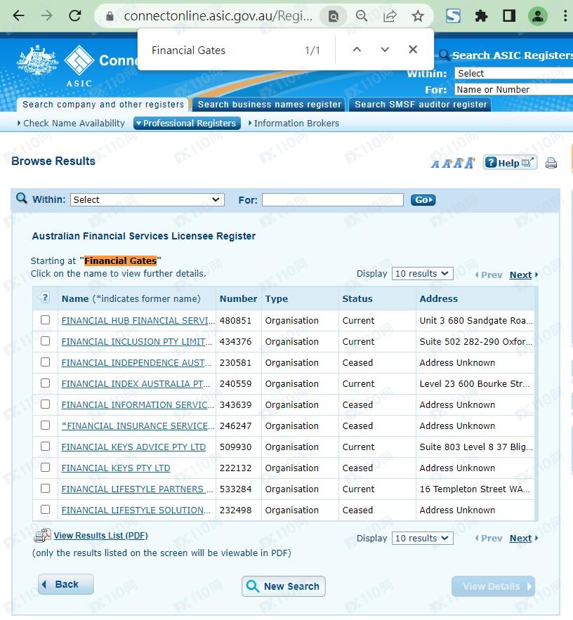 我們依聯系電話位置在澳大利亞證券及投資委員會(ASIC)查無Financial Gates的資料,確認該平臺無監管,請勿入金交易。