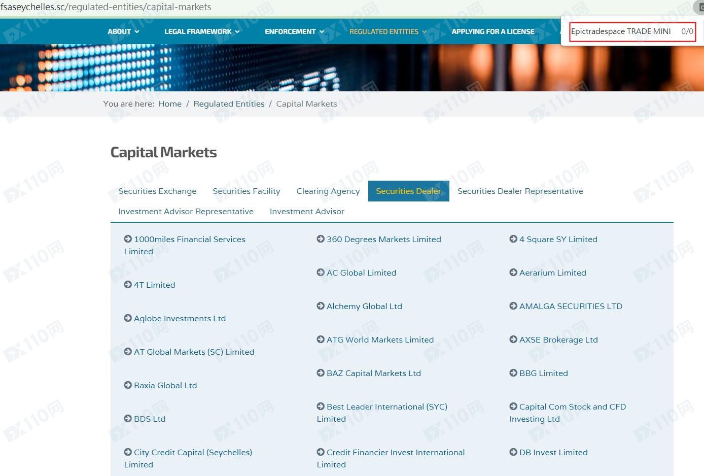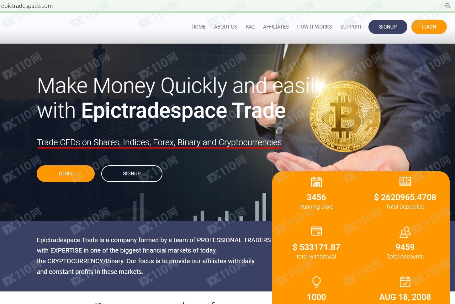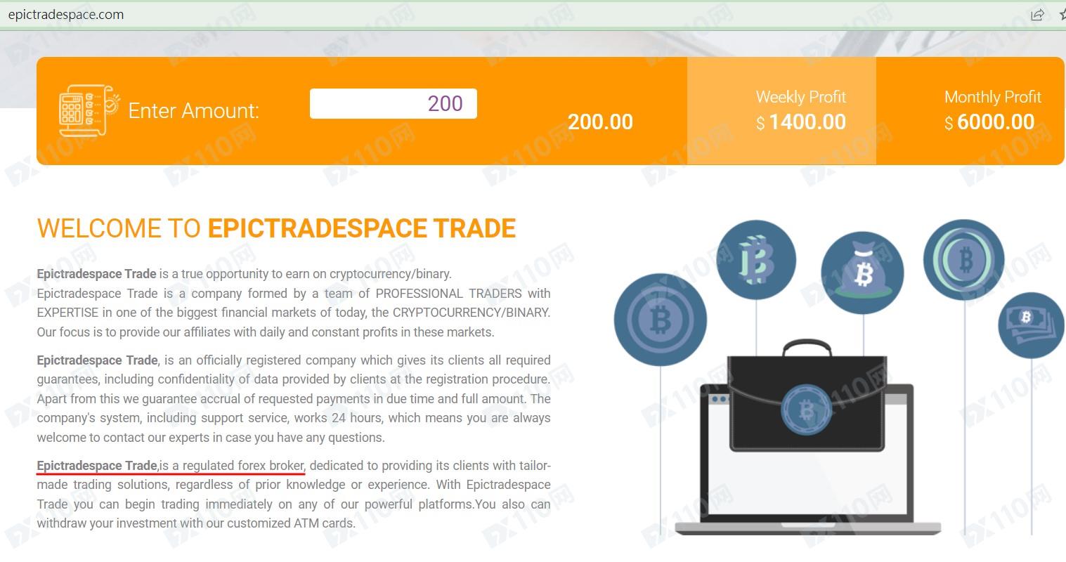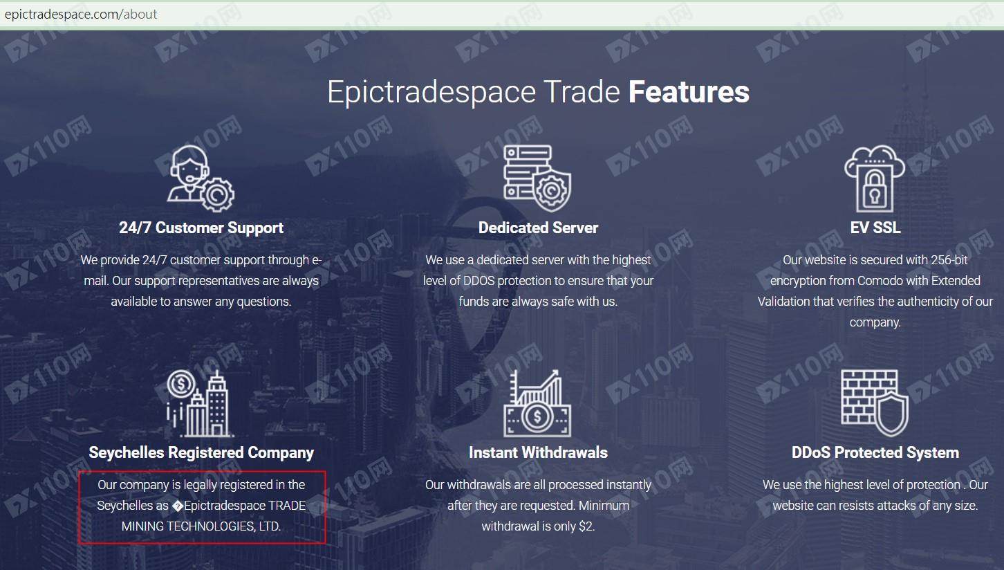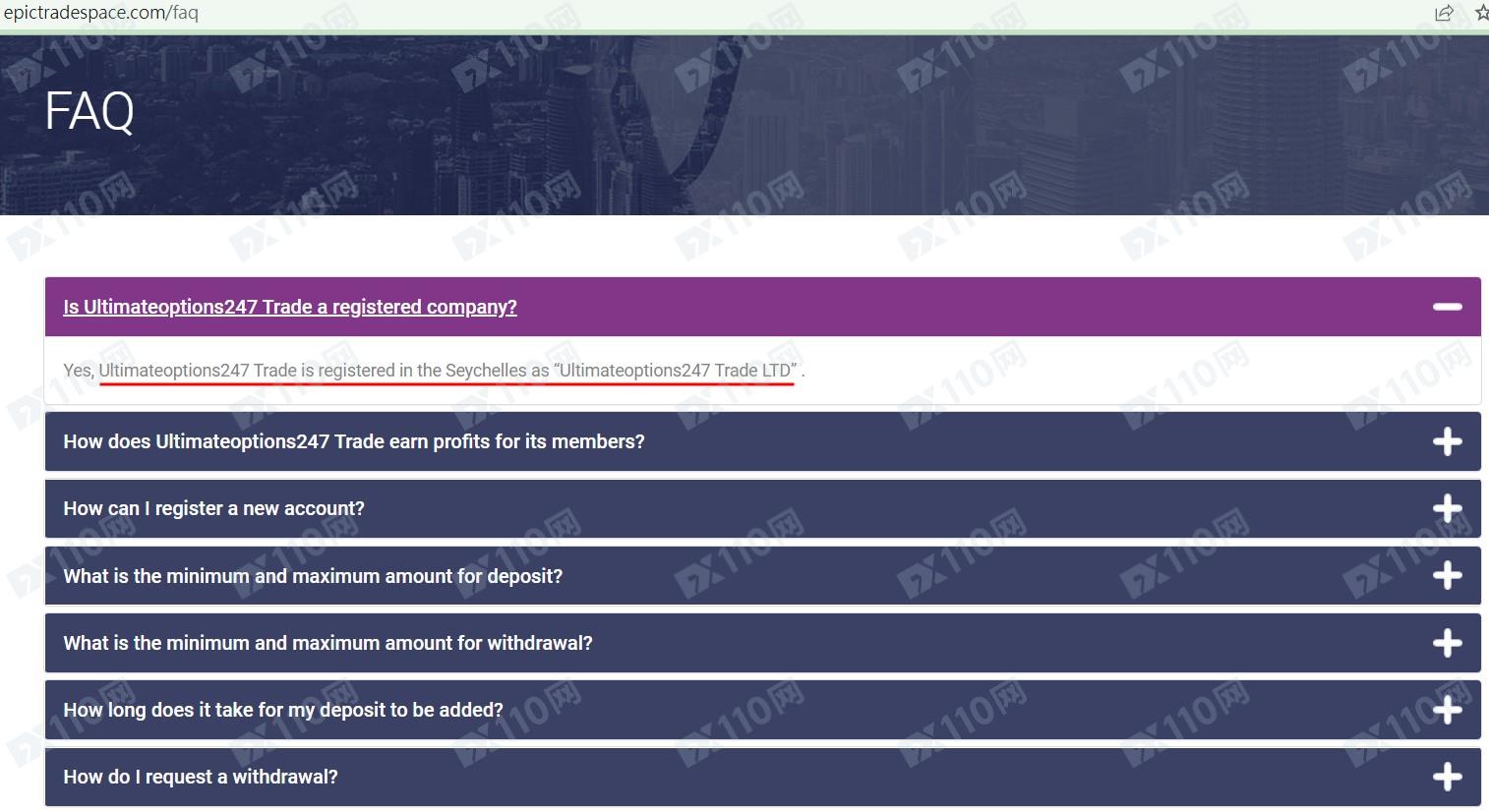 該平臺宣稱提供外匯、股指、加密貨幣等交易服務,公司注冊于塞舌爾,在不同頁面顯示的公司名稱為Epictradespace TRADE MINING TECHNOLOGIES, LTD及Ultimateoptions247 Trade LTD,是受監管的經紀商,但未公布任何監管信息。