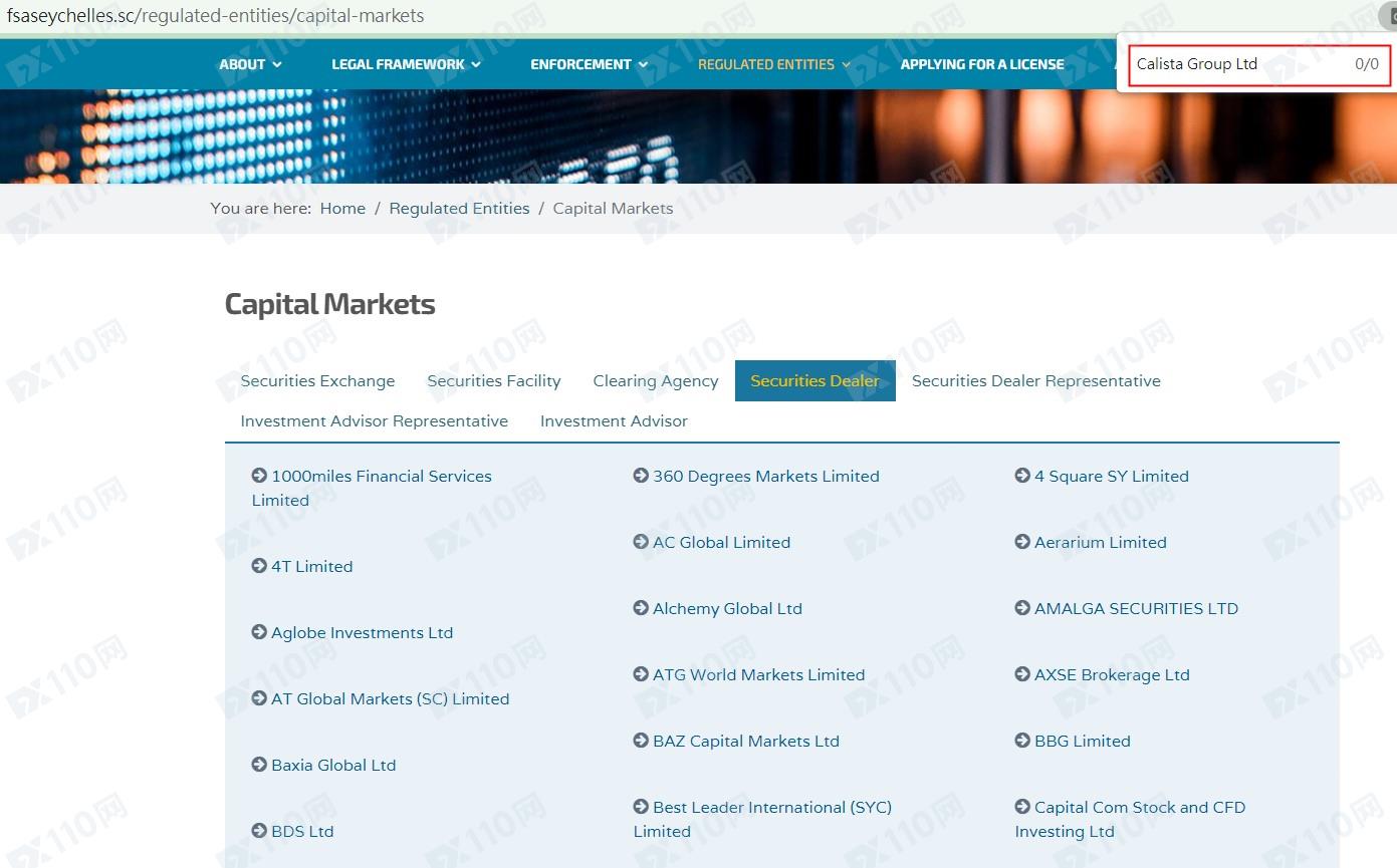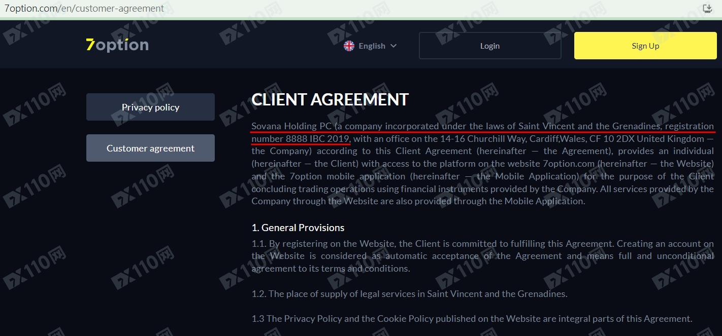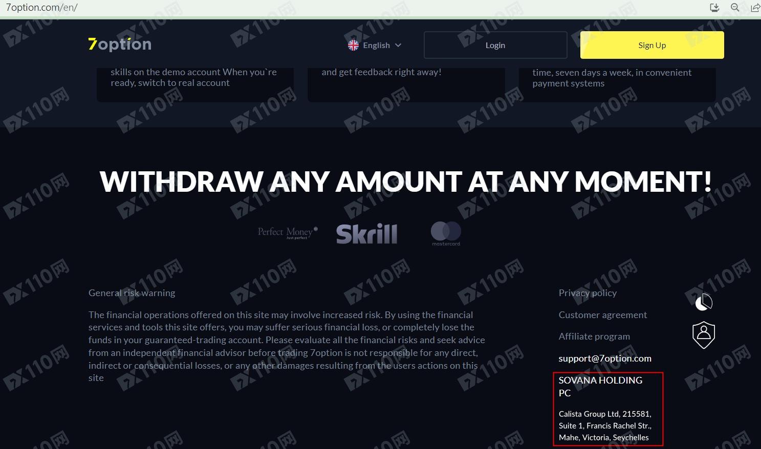 該平臺宣稱提供金融產品交易服務,Sovana Holding PC注冊于圣文森特和格林納斯丁,注冊號8888 IBC 2019,以及Calista Group Ltd位于塞舌爾,網頁中未公布任何監管信息以便用戶核實。