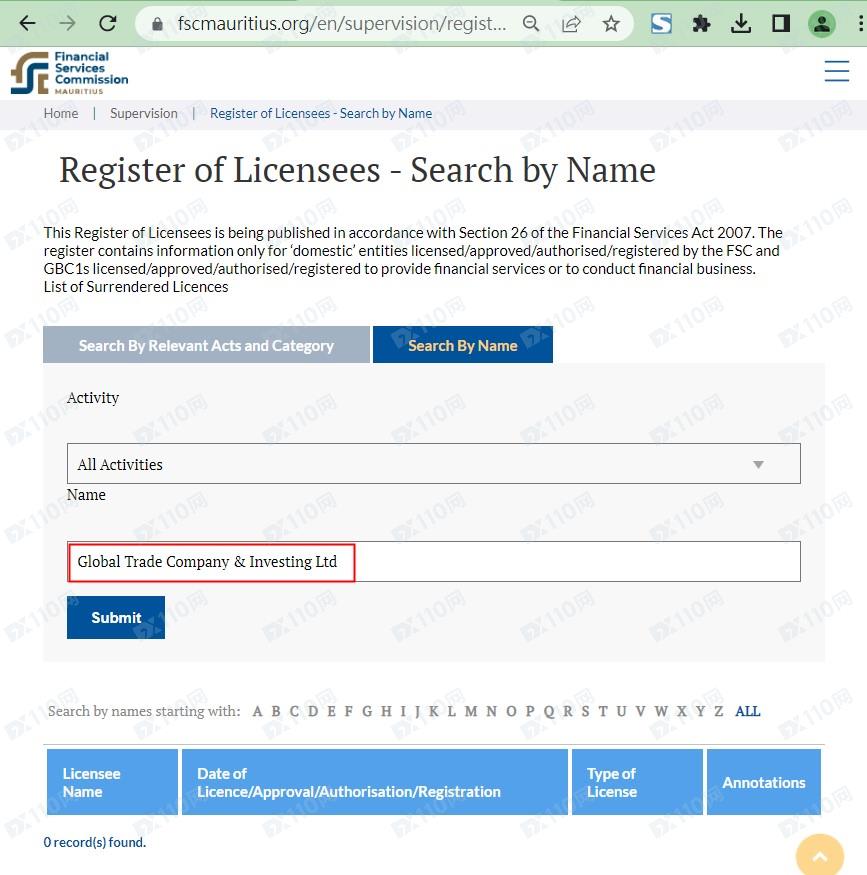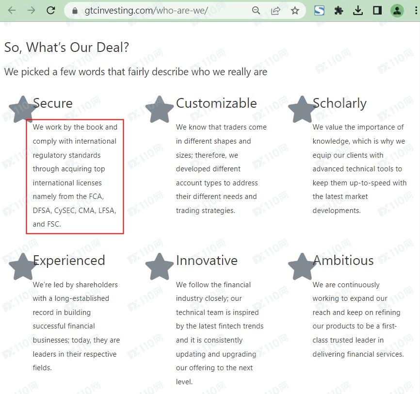 該平臺宣稱提供外匯、股指、商品等交易服務,持有塞舌爾公司證,登記名稱Global Trade Company & Investing Ltd,網頁中并標示獲得FCA、DFSA、CySEC、CMA、LFSA 和 FSC的頂級國際許可,嚴格遵守國際監管標準。