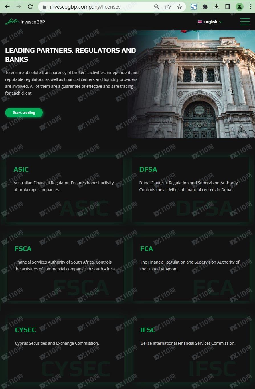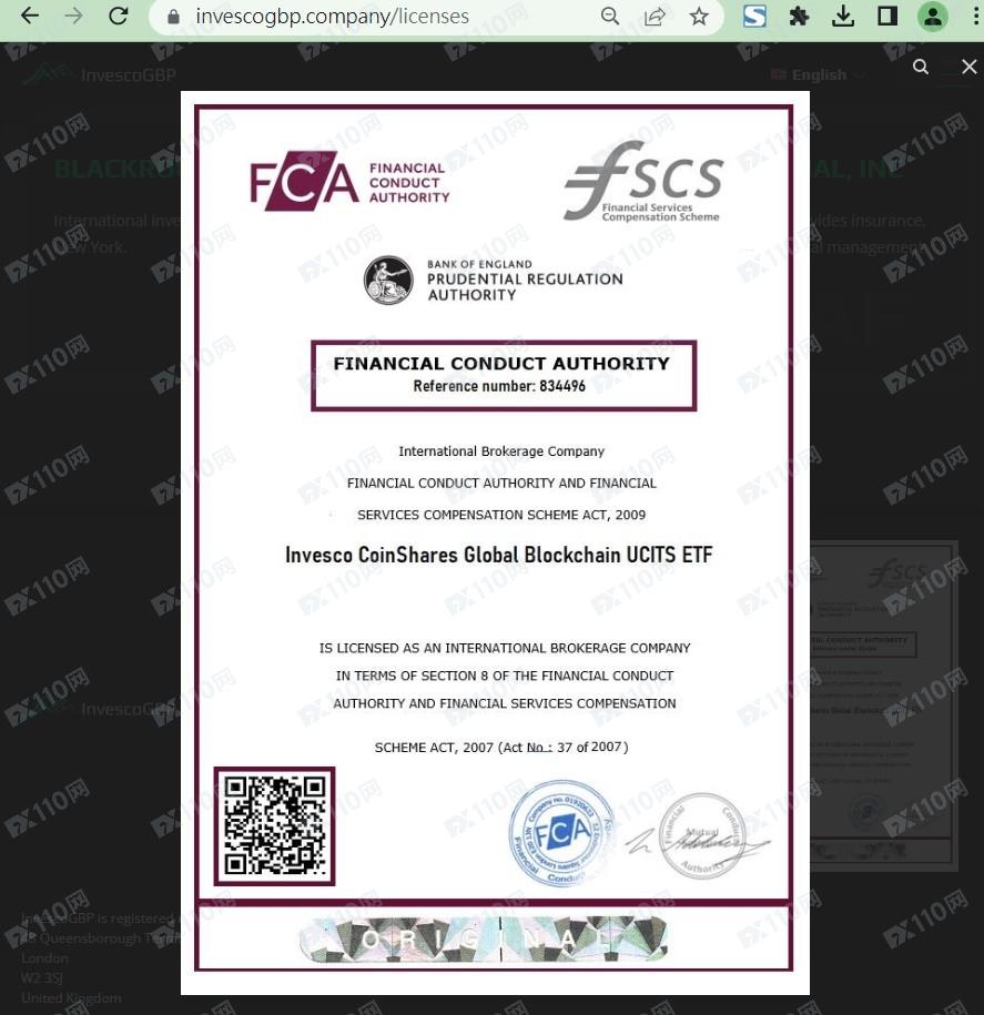 該平臺宣稱提供外匯、股指、貴金屬、加密貨幣等交易服務,持有英國金融行為監管局(FCA)證書,登記名稱Invesco CoinShares Global Blockchain UCITS ETF,證號834496,并受其及ASIC、DFSA、FSCA、CYSEC、IFSC等機構監管。