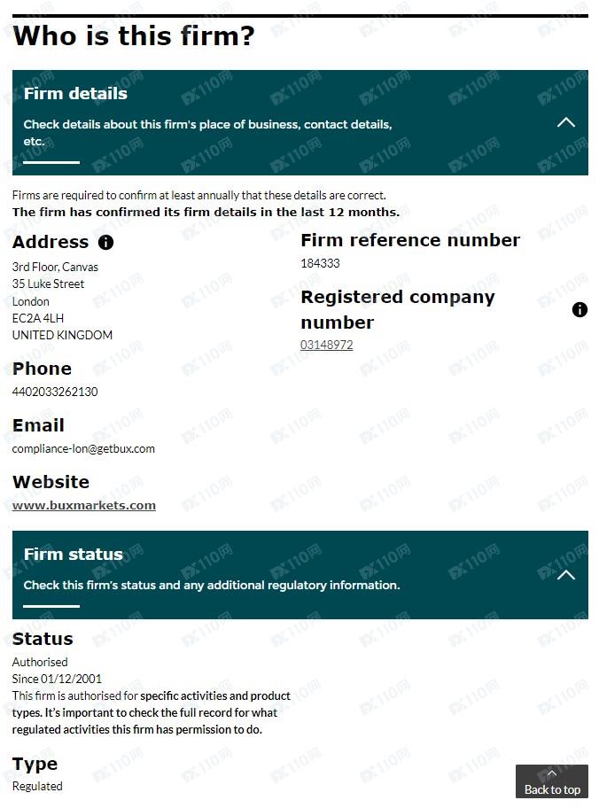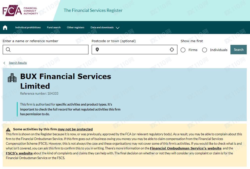 經查詢,英國FCA 184333對應公司名稱確實為BUX Financial Services Limited,登記網址為www.buxmarkets.com,網址不一致,顯然該平臺是套牌監管!