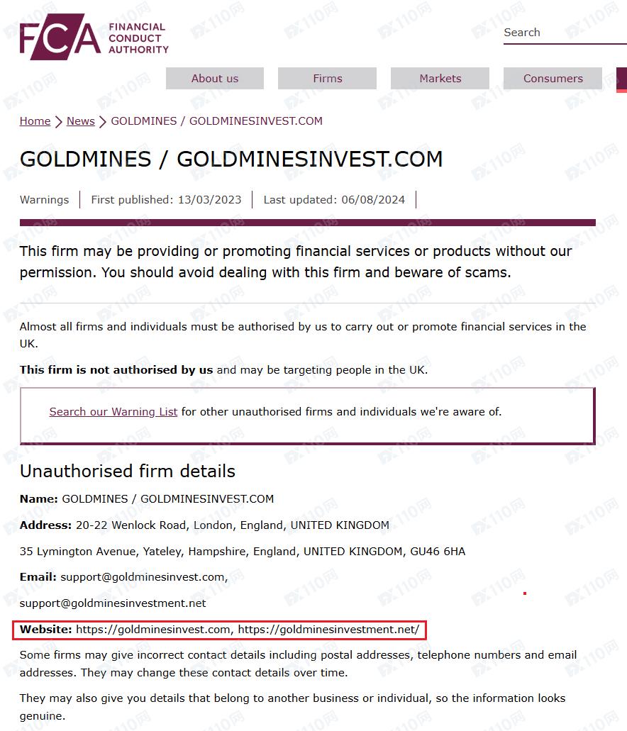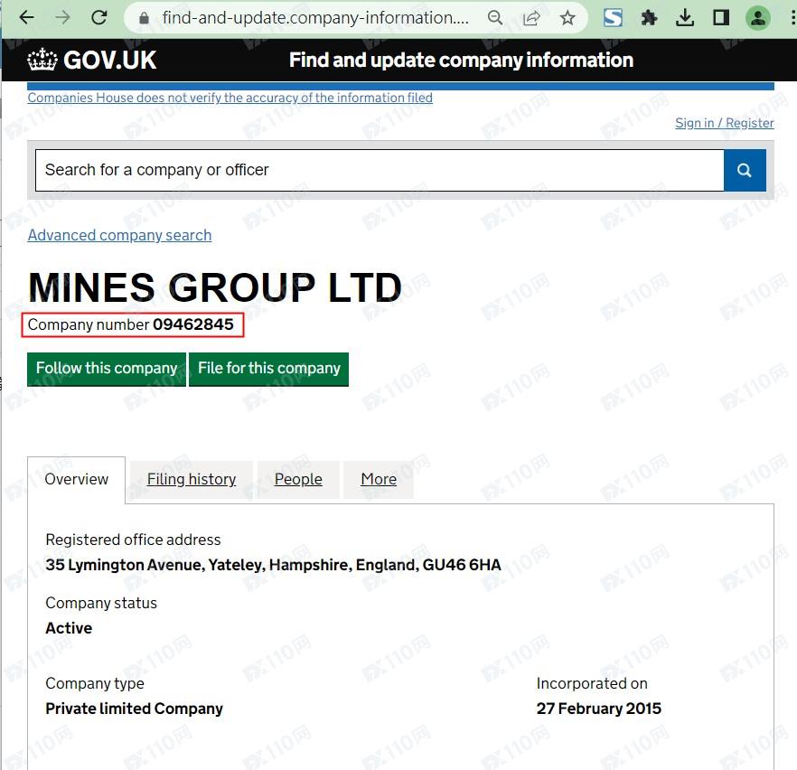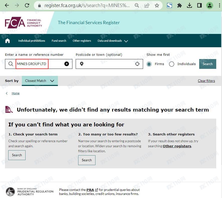 我們在英國公司注冊頁查到的對應公司名稱MINES GROUP LTD,再至英國金融行為監管局(FCA)查無資料,確認是無監管的平臺。