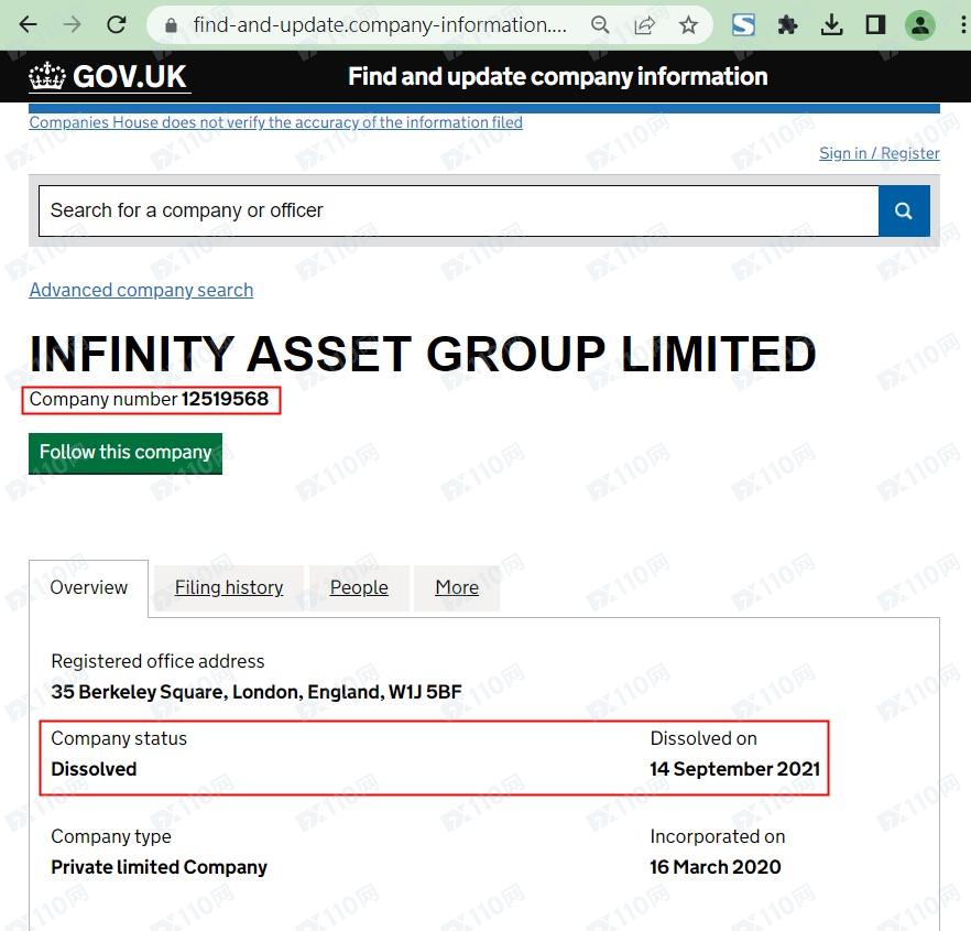 我們在英國公司注冊頁查無對應的公司名稱,而其注冊號對應的公司為INFINITY ASSET GROUP LIMITED,已于2021年9月14日注銷,顯然是假冒注冊。