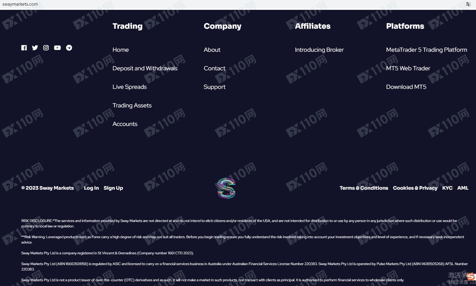 該平臺宣稱Sway Markets Pty Ltd注冊于圣文森特,注冊號為1661 CTD 2023,受澳洲監管,監管號為220383,提供外匯、加密貨幣、指數、大宗商品等金融衍生品投資交易服務。