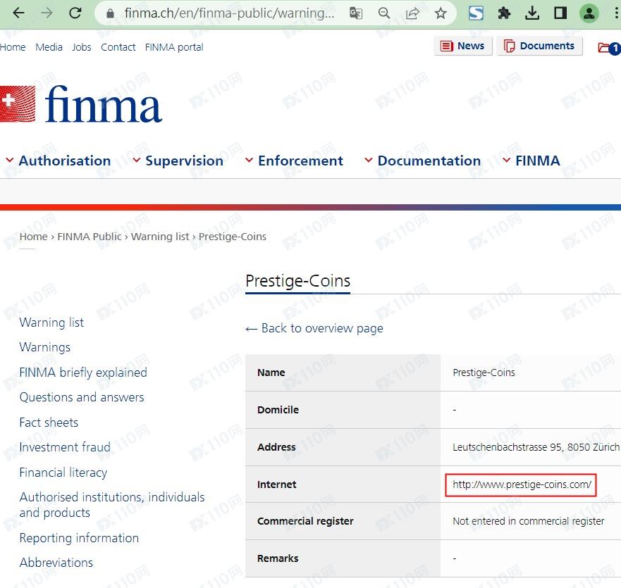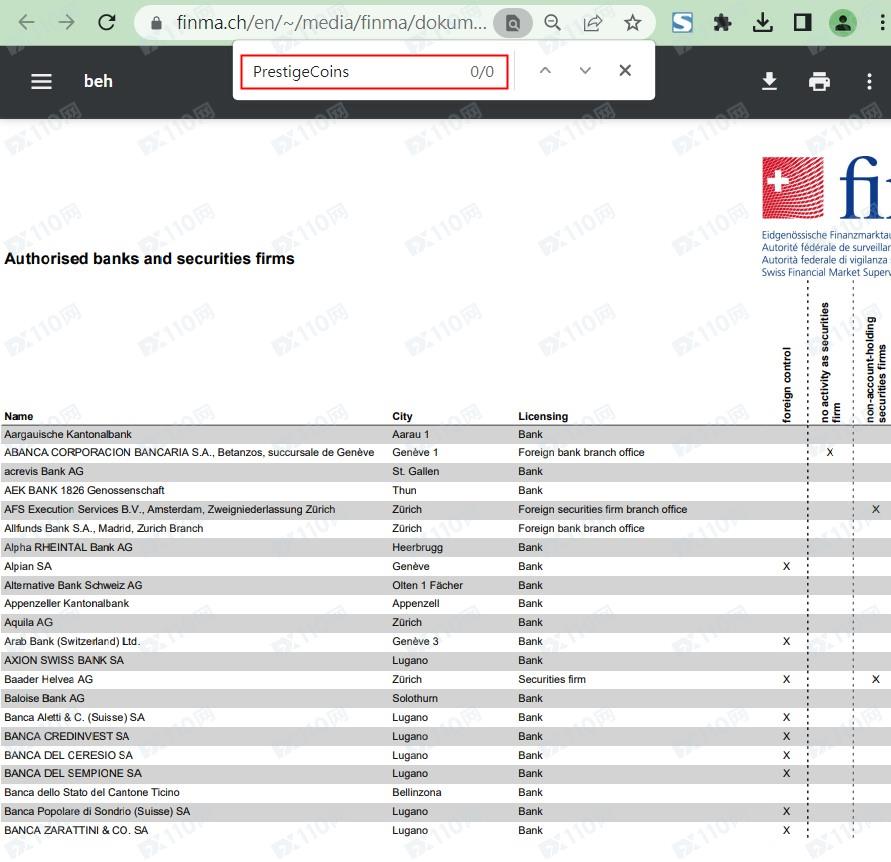 我們依標示位置在瑞士金融市場監督管理局(FINMA)也查無PrestigeCoins,確認是無監管的平臺。