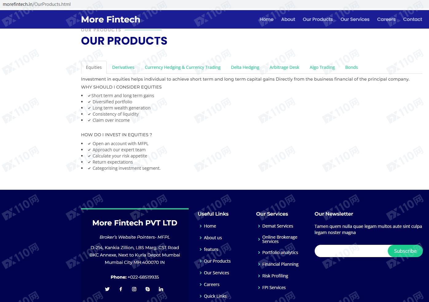 該平臺宣傳所屬More Fintech private limited,在印度證券交易委員會SEBI注冊為股票經紀商,是一家金融市場經紀公司,提供股票、衍生品、外匯、債券等金融衍生品投資交易服務。