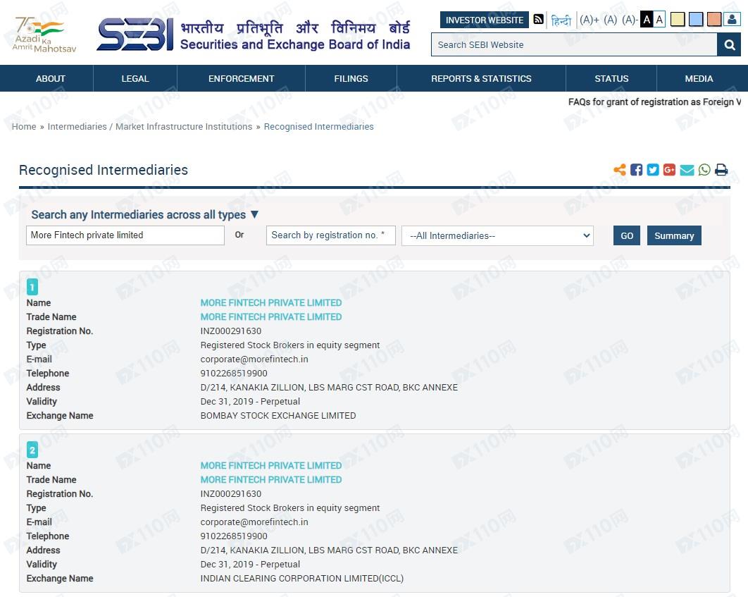 經查詢,在印度SEBI確實有查詢到MORE FINTECH PRIVATE LIMITED的登記,但請注意,印度并不監管金融衍生品經紀服務!