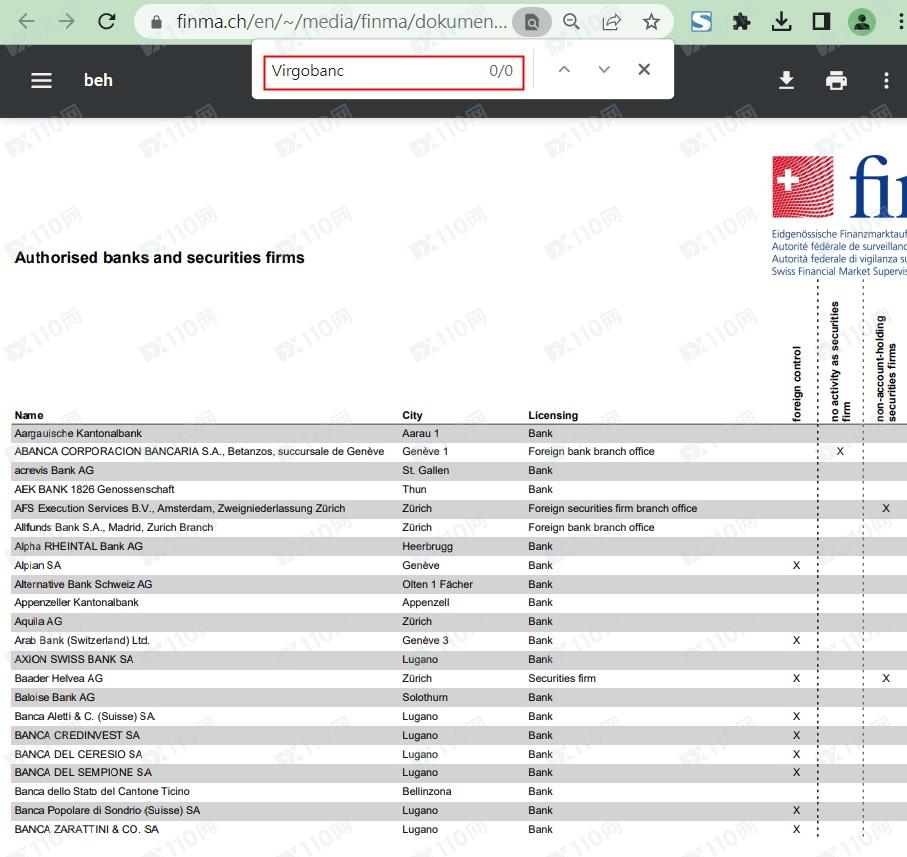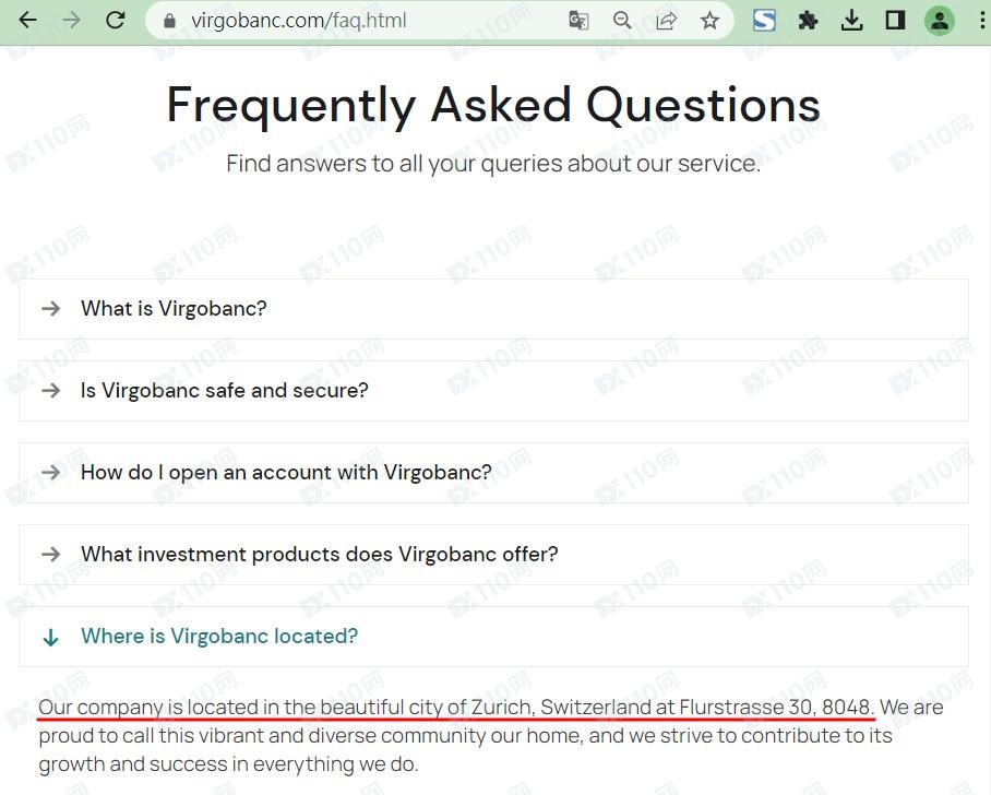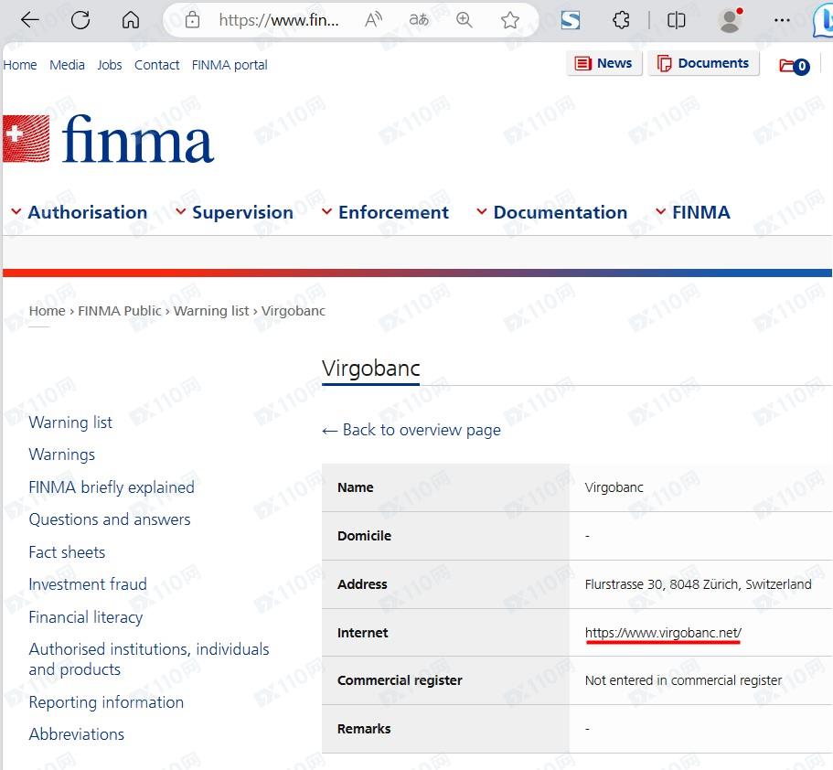 我們依標示位置在瑞士金融市場監督管理局(FINMA)也查無Virgobanc,確認是無監管的平臺。