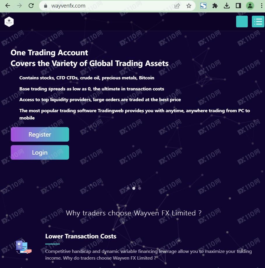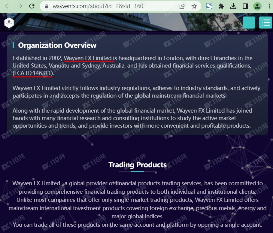 該平臺宣稱提供外匯、股指、貴金屬、加密貨幣等交易服務,由Wayven FX Limited運營,在美國、瓦努阿圖和澳大利亞設有分支機構,持有英國金融行為監管局(FCA)牌照,證號146311。