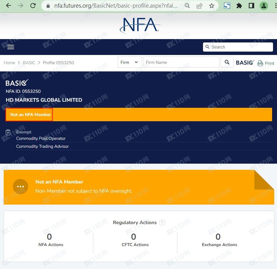 我們在美國MSB有查到對應的公司名稱,但此機構的業務權限為貨幣兌換業務,不監管金融衍生品;在美國NFA查到的名稱為HD MARKETS GLOBAL LIMITED,和平臺名稱不符,且僅是普通註冊,不是NFA會員,同樣不受其監管。