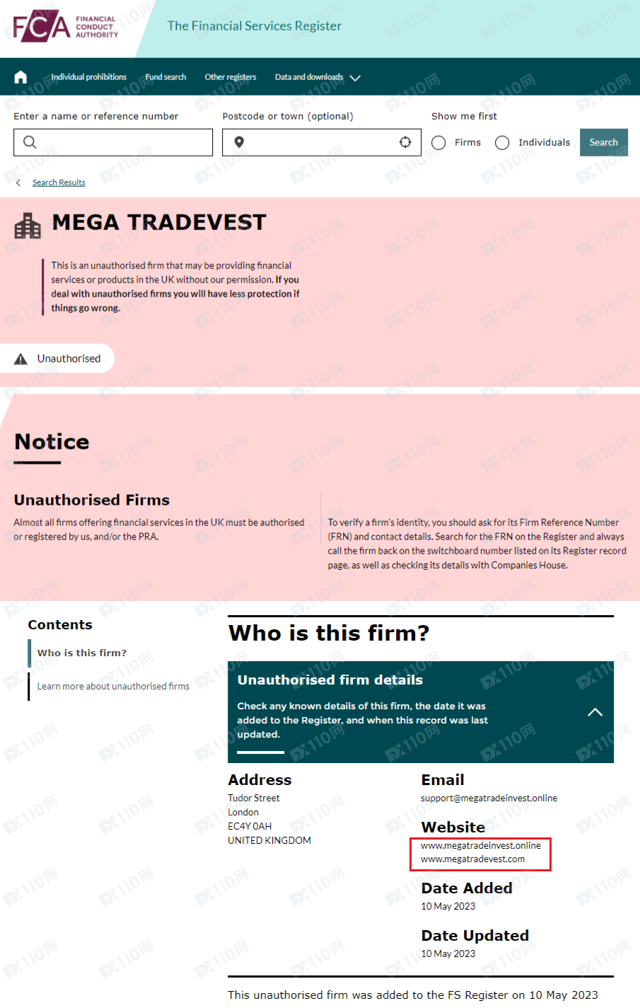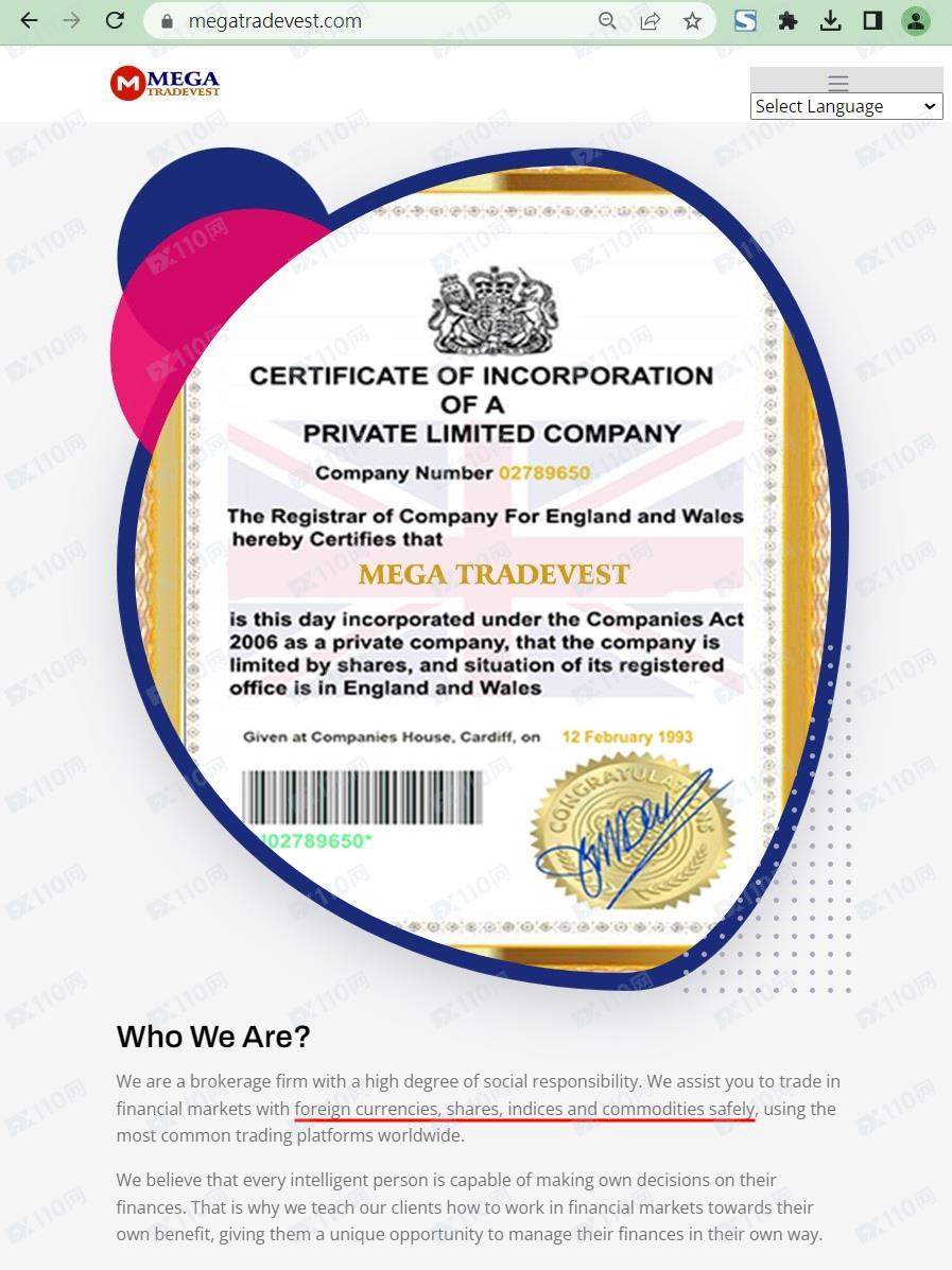 該平臺宣稱提供外匯、股指、商品等交易服務,持有英國公司證,登記名稱MEGA TRADEVEST,注冊號02789650,但未公布監管信息以便用戶核實。