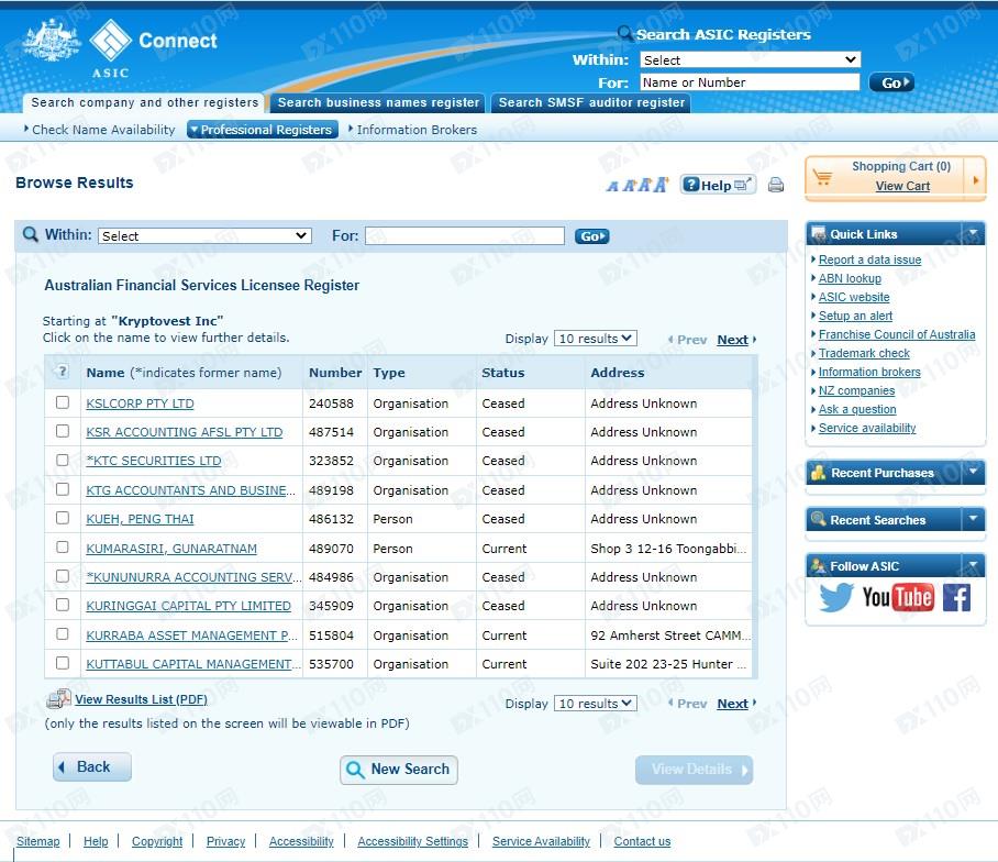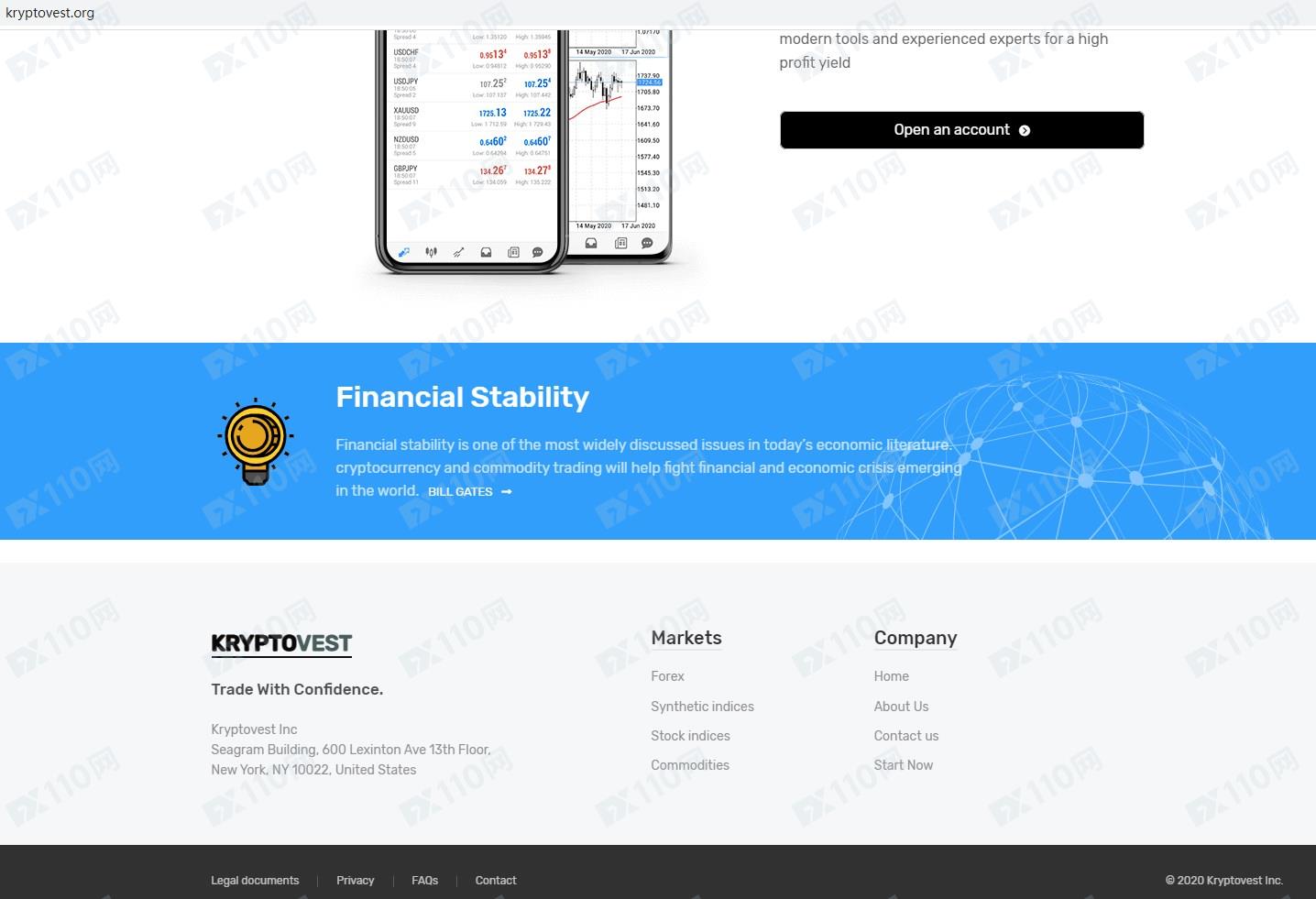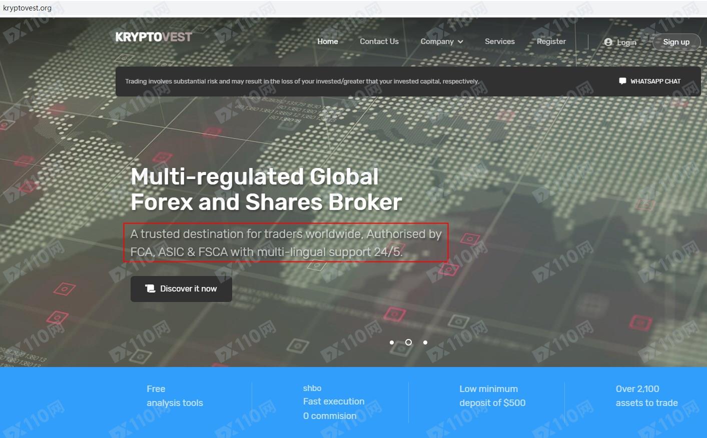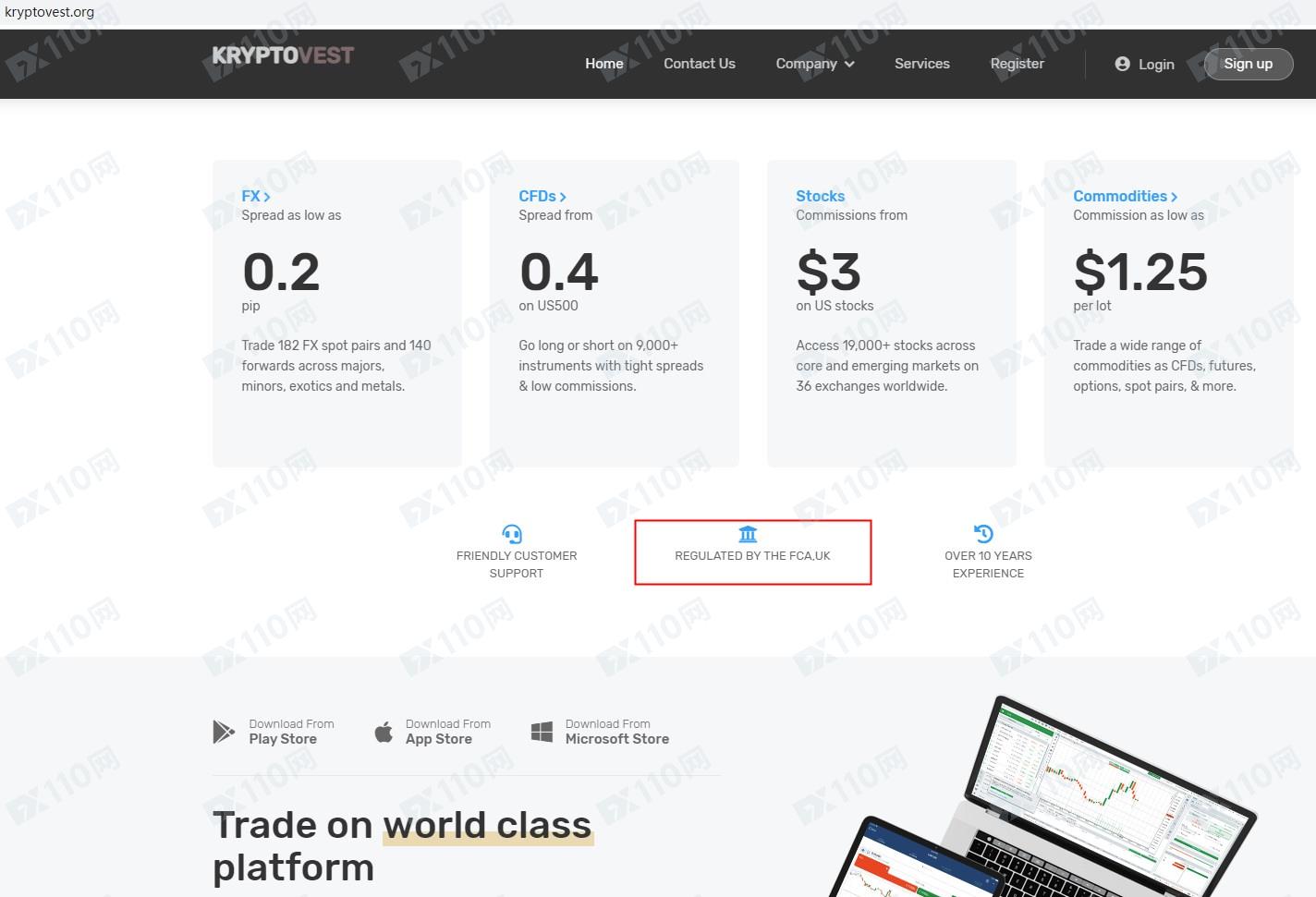 該平臺宣稱所屬Kryptovest Inc,地址位于美國,獲得英國FCA、澳洲ASIC和南非FSCA授權的交易商,提供外匯、差價合約、股票、大宗商品等金融衍生品投資交易服務。
