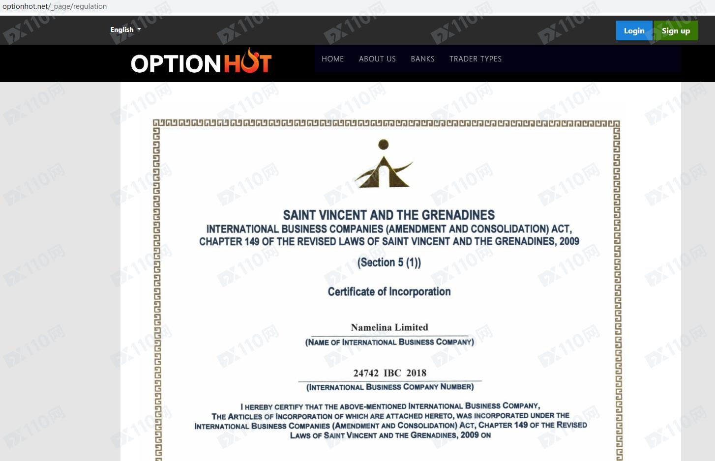 OptionHot平臺自稱是一家二元期權經紀商,持有圣文森特FSA牌照,公司名稱為Namelina Limited,注冊號24742 IBC 2018,提供外匯期權交易服務。