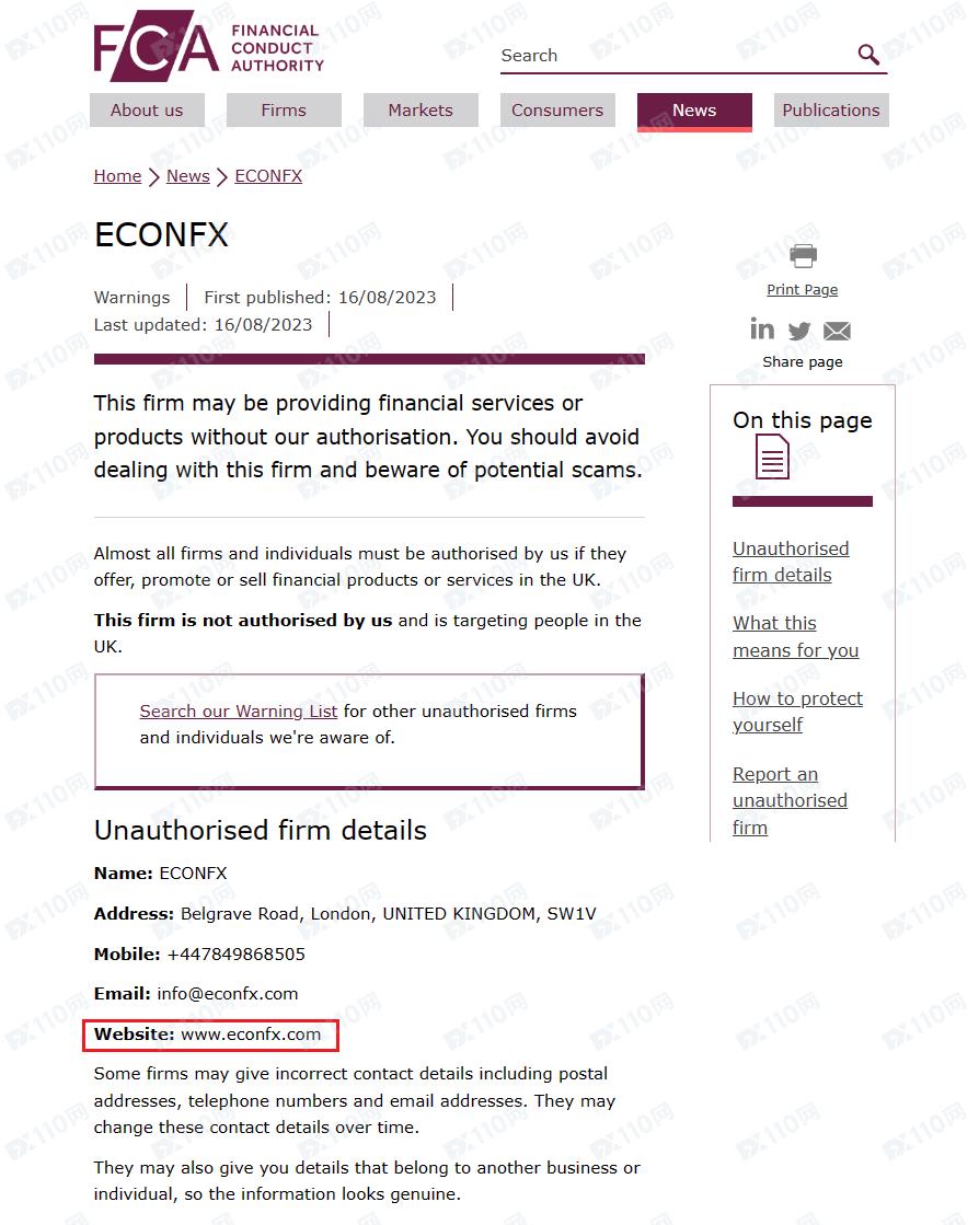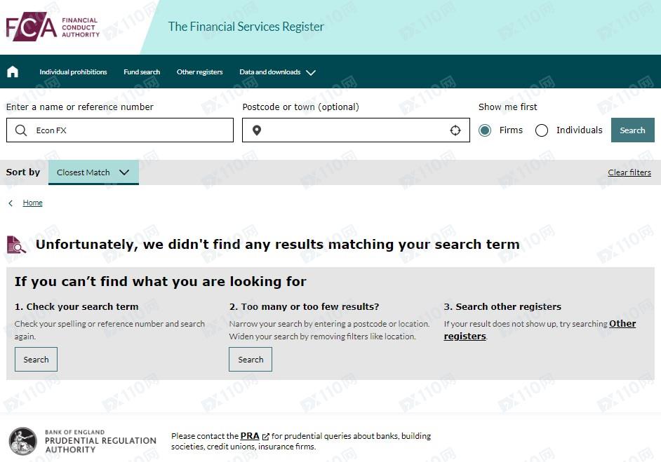 經查詢,英國FCA監管局并沒有Econ FX的登記,顯然不受監管。