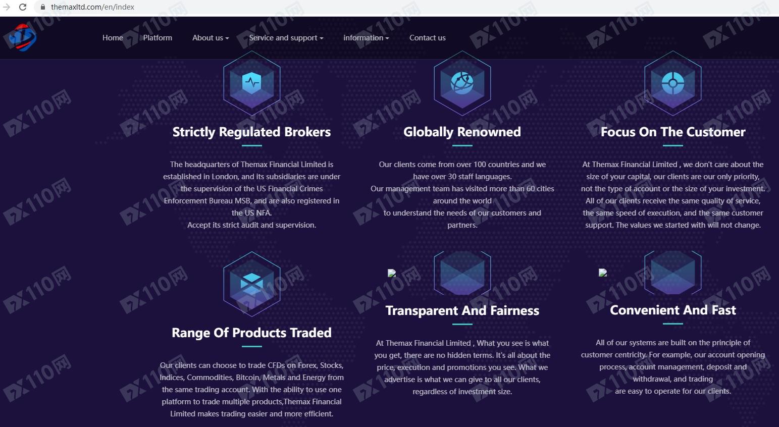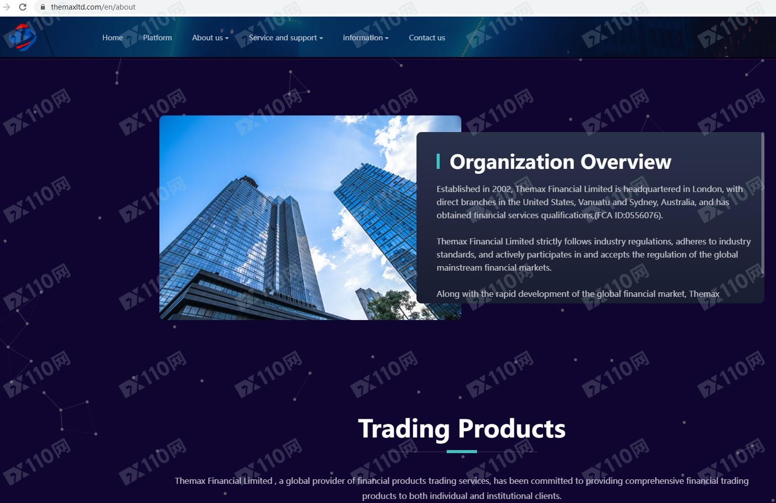 Themax Financial Limited宣傳總部設立于英國倫敦,旗下子公司受美國金融犯罪執法局MSB監管,同時在美國NFA注冊,NFA ID : 0556076,還自稱獲得了英國FCA的資質,FCA ID:0556076,提供股票、期貨、原油、貴金屬、加密貨幣、外匯等金融衍生品投資交易服務。