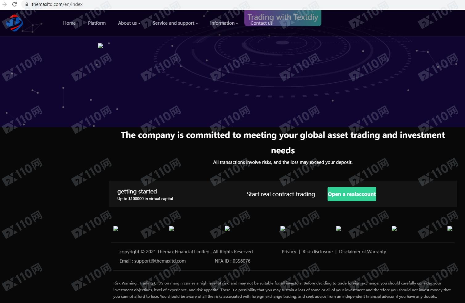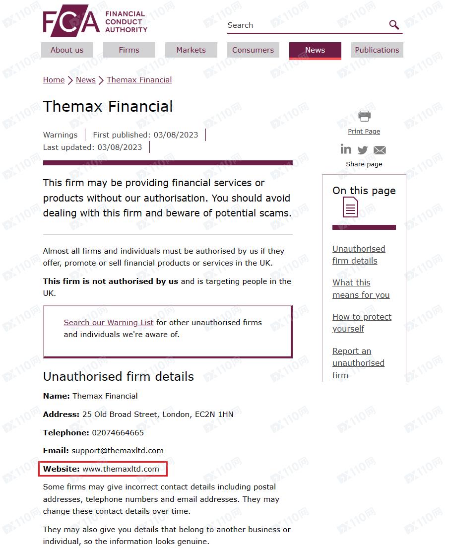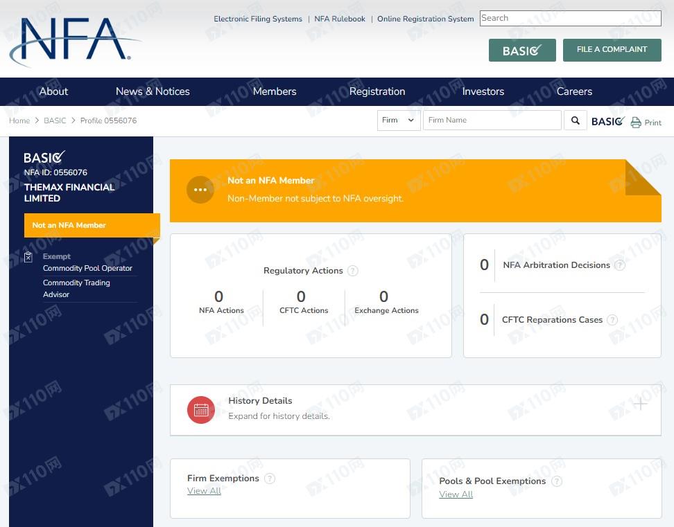 經查詢,美國NFA 0556076對應公司名稱為THEMAX FINANCIAL LIMITED,非NFA會員,FCA 0556076查無任何結果,顯然不受監管,另外請注意,美國FinCEN的MSB業務權限僅為貨幣兌換業務,不能提供外匯保證金業務,無金融衍生品的授權和監管權限。