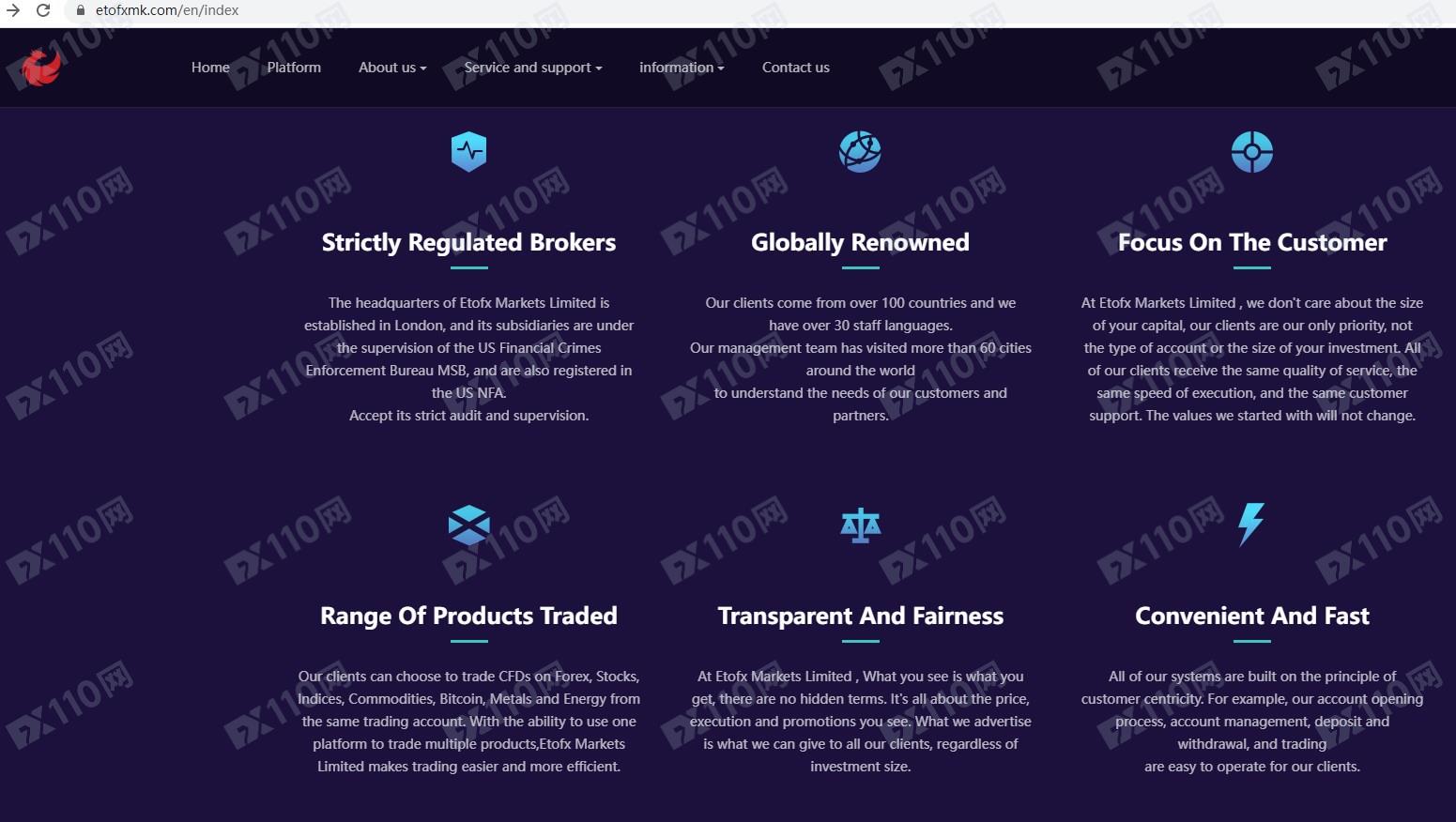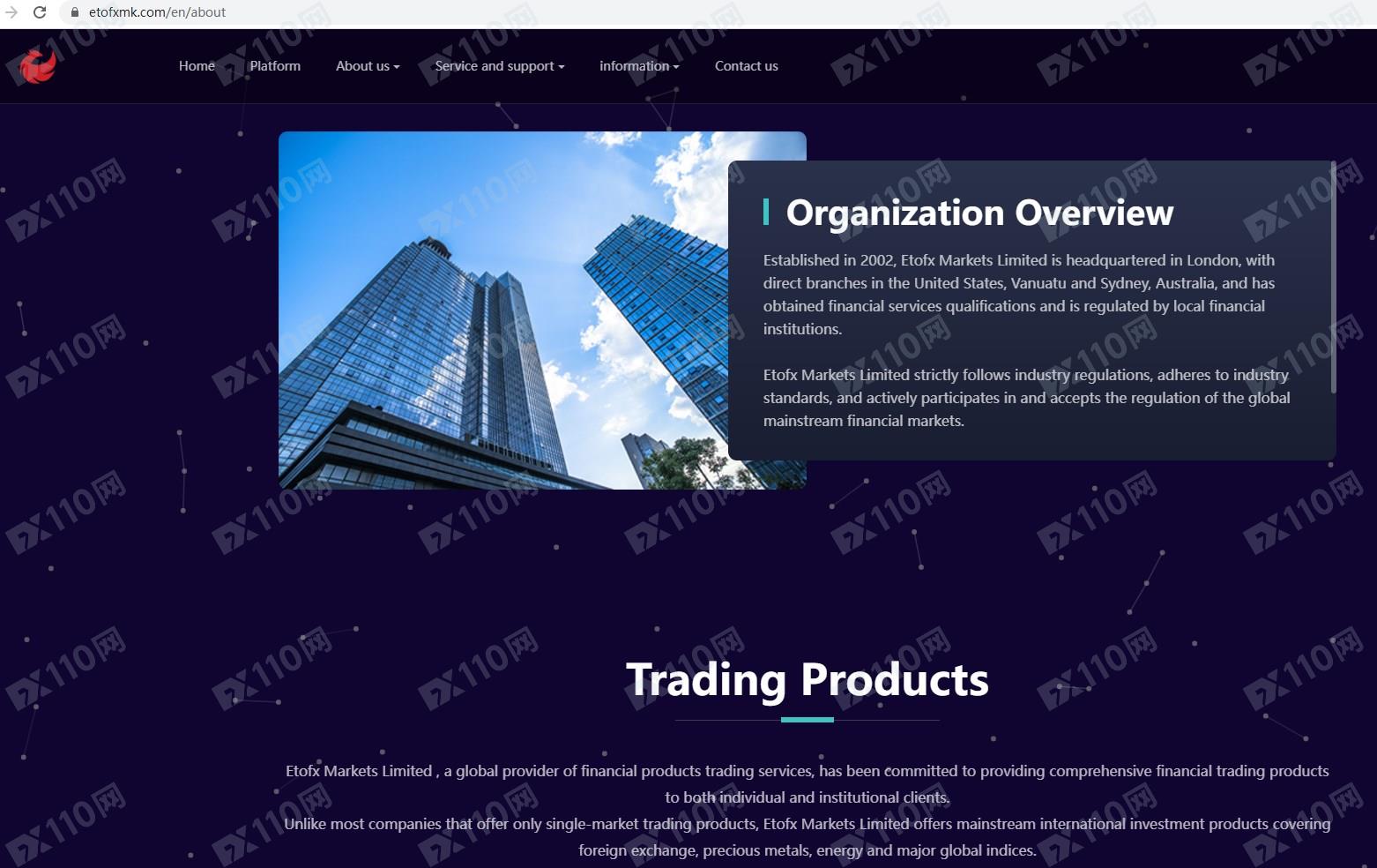 Etofx Markets Limited宣傳總部位于英國倫敦,旗下子公司受美國金融犯罪執法局MSB監管,同時在美國NFA注冊,在美國、瓦努阿圖、澳大利亞都設有辦公處,獲得當地金融機構的授權和金融服務資質,提供股票、期貨、原油、貴金屬、比特幣、外匯等金融衍生品投資交易服務。