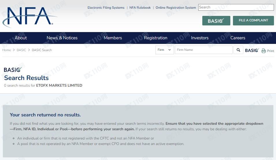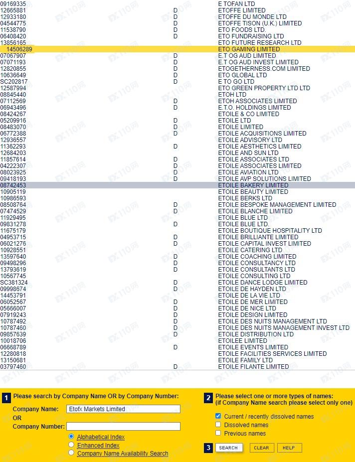 經查詢,英國工商局并無Etofx Markets Limited的注冊登記,也不受英國FCA和美國NFA的監管。