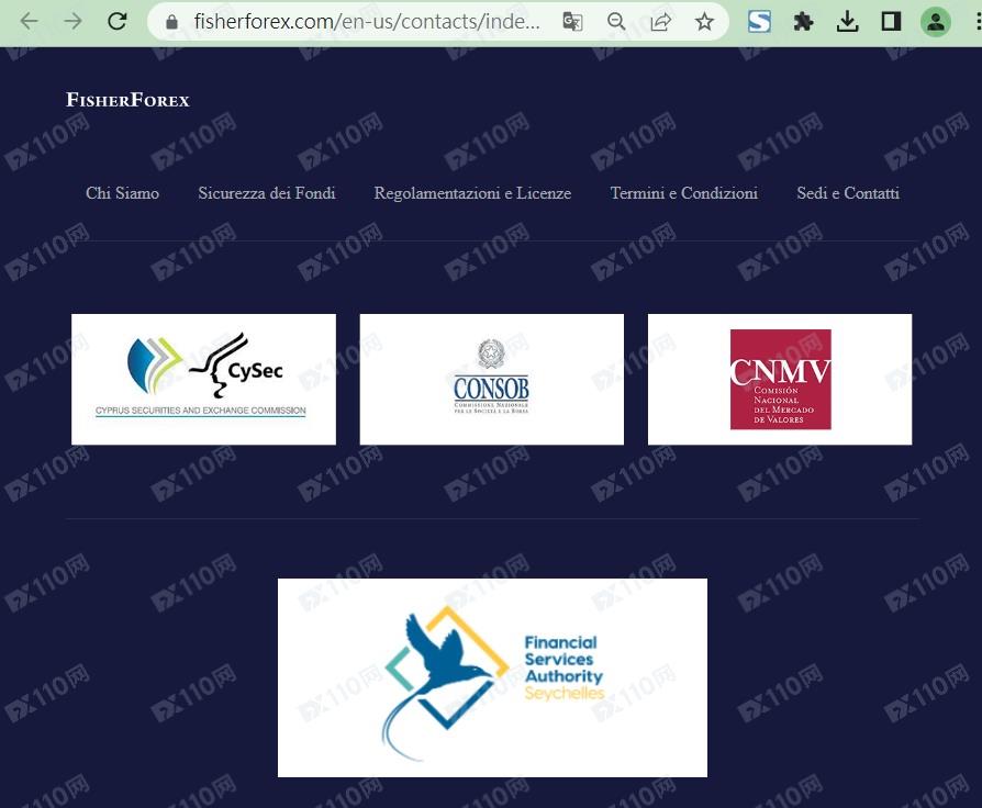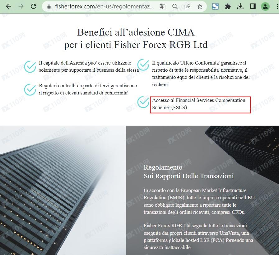 該平臺宣稱提供外匯、股指等差價合約交易服務,公司名稱Fisher Forex RGB Ltd,獲得金融服務補償計劃FSCS,網頁下方并標示多家監管機構圖示,但未說明是否受其監管。