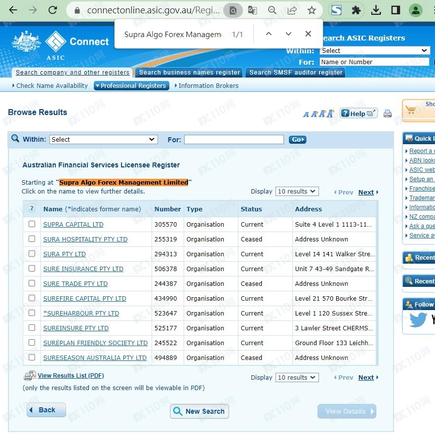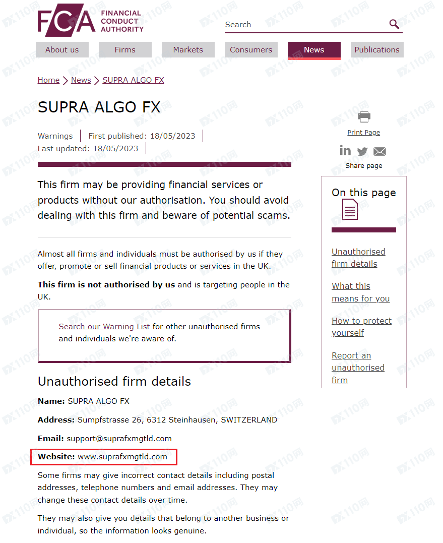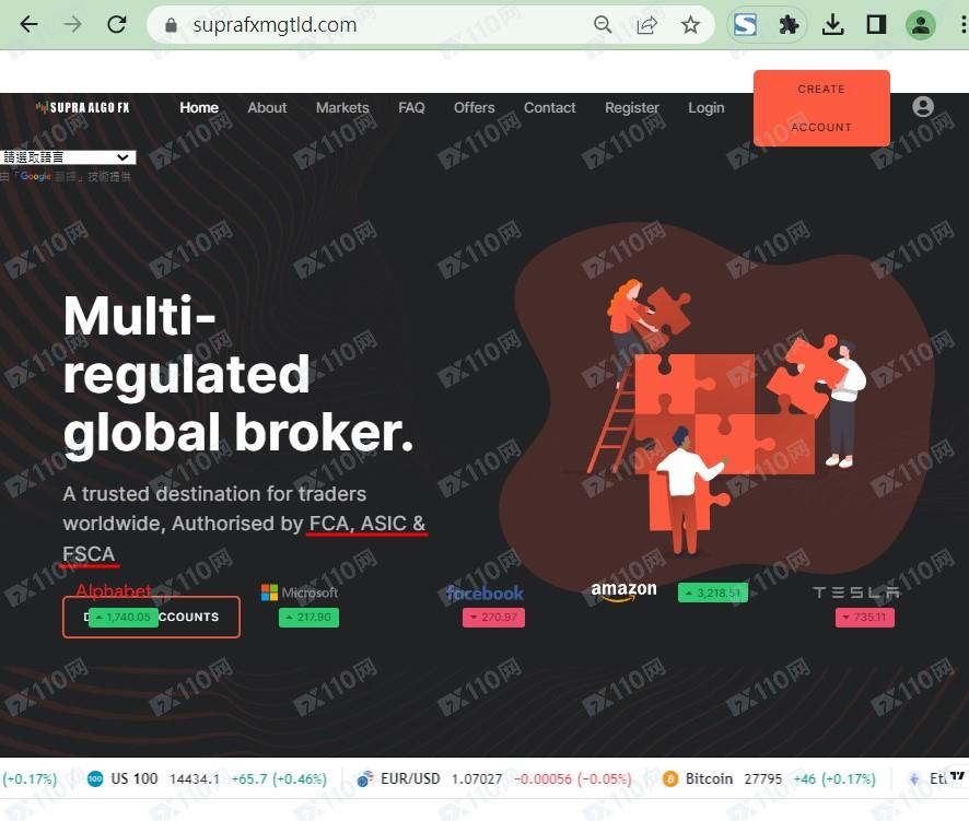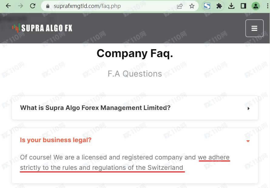該平臺宣稱提供外匯、股指、商品等交易服務,公司名稱Supra Algo Forex Management Limited,是一家持牌注冊公司,嚴格遵守瑞士的規章制度,擁有英國FCA、澳大利亞ASIC、南非FSCA等監管機構授權。