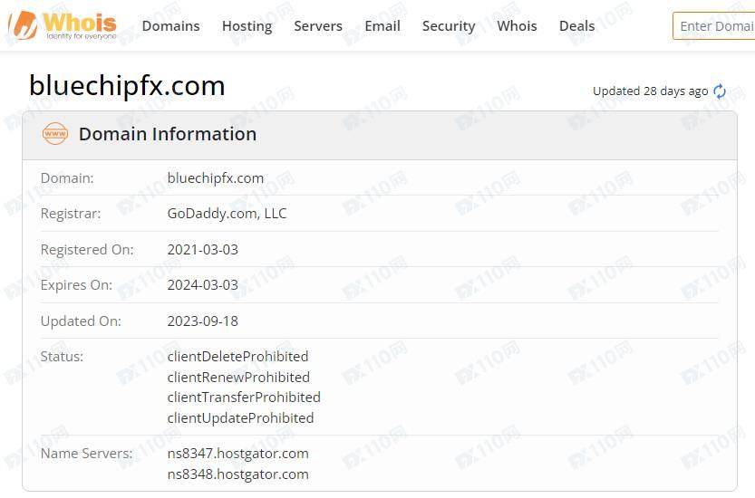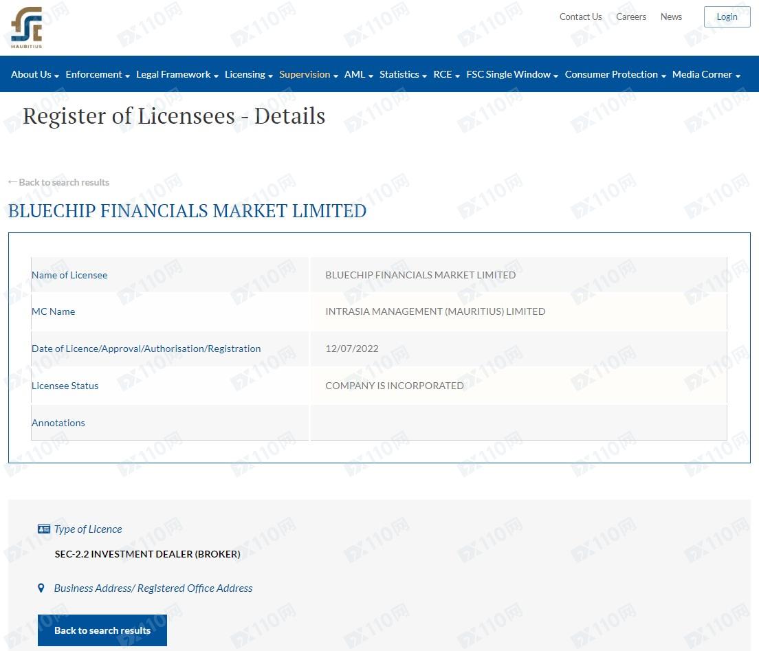 經查詢,在毛里求斯FSC有查詢到一家BLUECHIP FINANCIALS MARKET LIMITED,未登記網址。