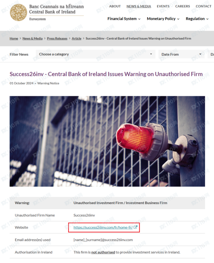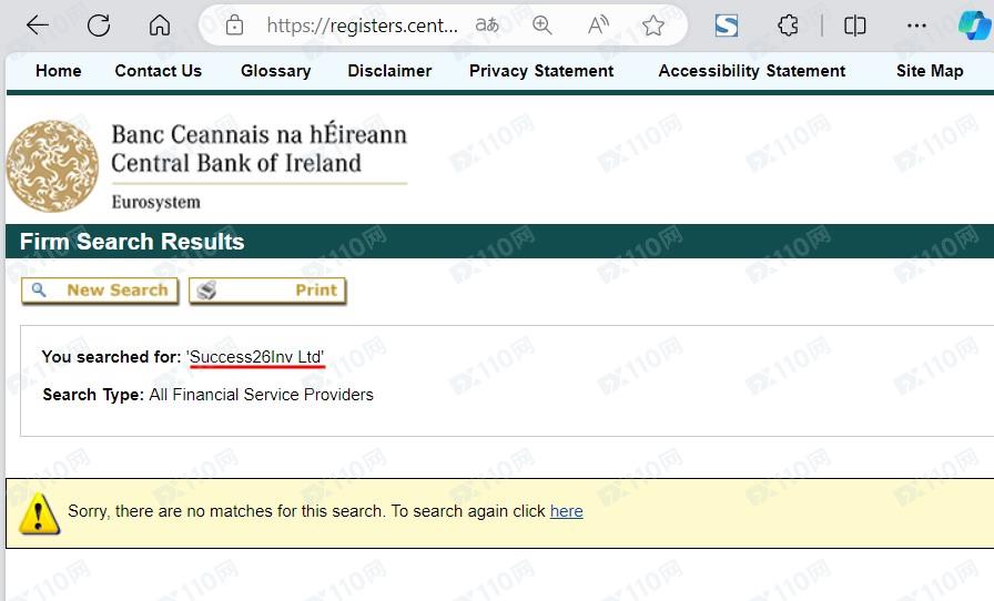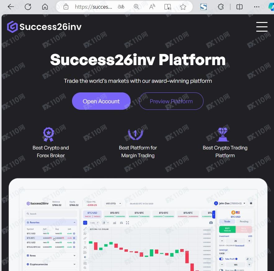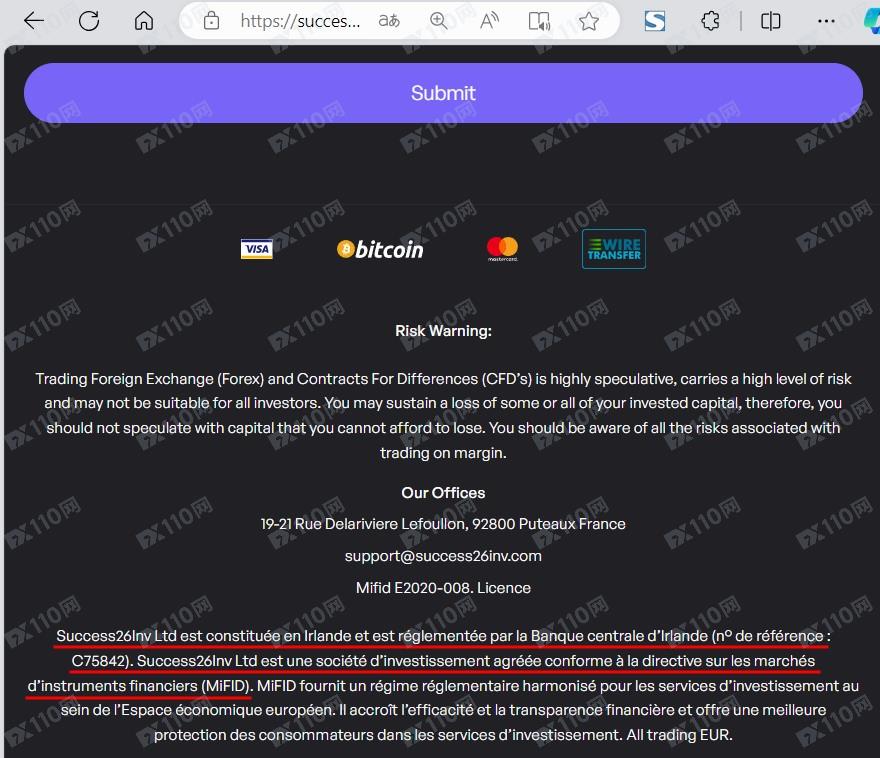 該平臺宣稱是一家國際在線經紀商,提供外匯、加密貨幣等交易服務,由Success26Inv Ltd運營,受愛爾蘭央行(CBI)監管,編號C75842,并符合歐洲金融工具市場指令(MiFID)。
