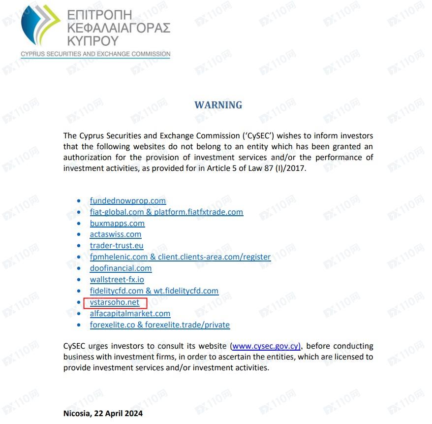 經查詢,塞浦路斯CySEC 409/22對應公司名稱確實為VSTAR & SOHO MARKETS LTD,但登記網址為www.sohomarkets.eu和www.vstarprime.com,vstarsoho.net與VSTAR & SOHO MARKETS LTD無任何關聯,顯然是套牌監管的虛假平臺。
