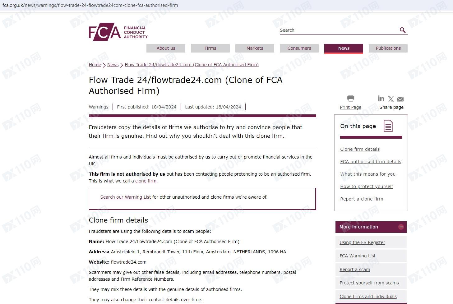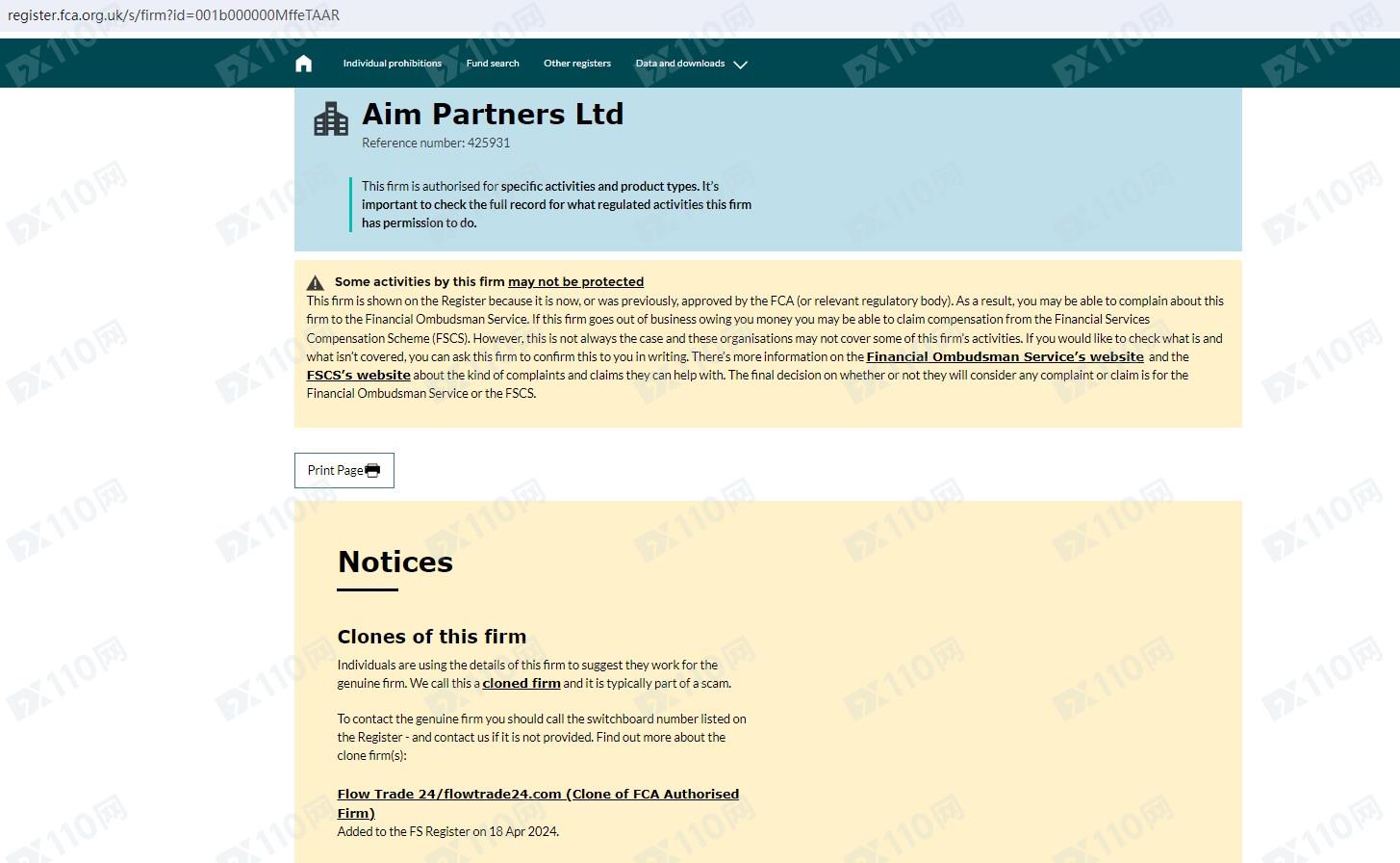 經查詢,英國FCA確實有登記一家Aim Partners Ltd,但FCA公布Flow Trade 24/flowtrade24.com是克隆公司,顯然平臺未獲得授權和許可。